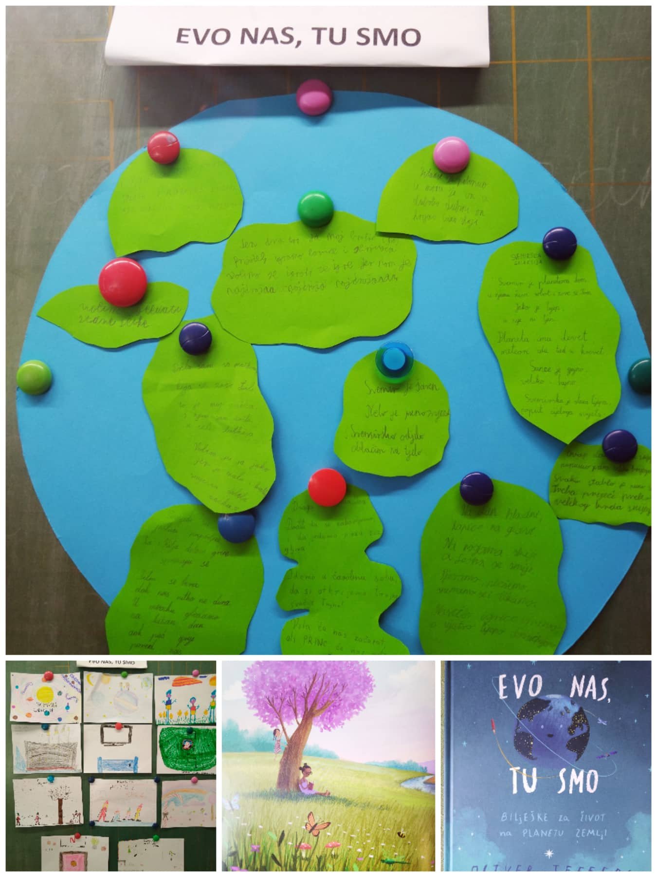 U rujna je školska knjižničarka s učenicima četvrtog razreda, mladim knjižničarima te petim razredom održala radionice s temom planeta Zemlja. Naziv prve radionice bila je Evo nas, tu smo, u kojoj je u središtu bila istoimena slikovnica autora Olivera Jeffersa. Inače, spomenutu je slikovnicu autor posvetio svojem sinu u kojemu u slikovnici pripovijeda o Zemlji. Na početku sata, školska je knjižničarka napisala na ploču misao Evo nas, tu smo. Razgovarali smo o tome kakav je osjećaj biti tu, na ovome satu, kako se učenici osjećaju zbog činjenice što su se vratili u školu, što su manje kod kuće, što su među prijateljima. Na kraju ih je školska knjižničarka upitala čemu se nadaju ove školske godine. Nakon razgovora učenici su proučavali ilustracije u slikovnici. Upitala ih koja ih je ilustracija najviše privukla, kako se osjećaju zbog te ilustracije, podsjeća li ih poneka ilustracija na nekakav događaj iz života. Budući da se književnik obraća svome sinu u slikovnici, učenici su se i sami prisjetili događaja kada su još bili mlađi. Nakon toga školska je knjižničarka rekla učenicima da zamisle mjesto na kojem bi u ovom trenutku željeli biti. Upitala ih je da zamisle boje koje prevladavaju na tom mjestu te kakvu emociju pobuđuje slika koju su zamislili. Učenici su zamišljena mjesta nacrtala te na temelju crteža napisali poeziju koju smo postavili na plavu podlogu koja je činila planetu Zemlja. Razgovarali smo o tome koliko smo svi značajni na ovom svijetu.