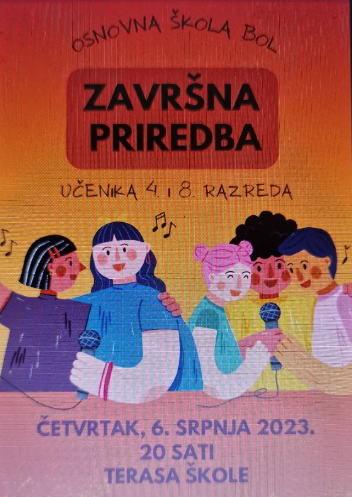 evo i ove godine ispraćamo naše drage učenike četvrtog i osmog razreda u neka nova razdoblja života. Završna priredba biti će održana 06. srpnja 2023. godine u 20:00, na školskoj terasi.