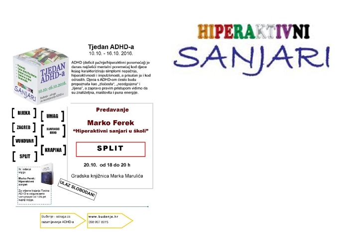 ADHD (deficit pažnje/hiperaktivni poremećaj) je danas načešći mentalni poremećaj kod djece a prisutan je i kod odraslih. Zastupljen je kod 3-8 % školske djece. U svrhu podizanja svijesti o ovome problemu brojne organizacije u Europi tijekom rujna i listopada organiziraju različite aktivnosti. Udruga Buđenje iz Zagreba u sklopu tjedna ADHD-a organizira predavanje na ovu temu u Gradskoj knjižnici Marka Marulića, a ulaz je slobodan za sve zainteresirane: