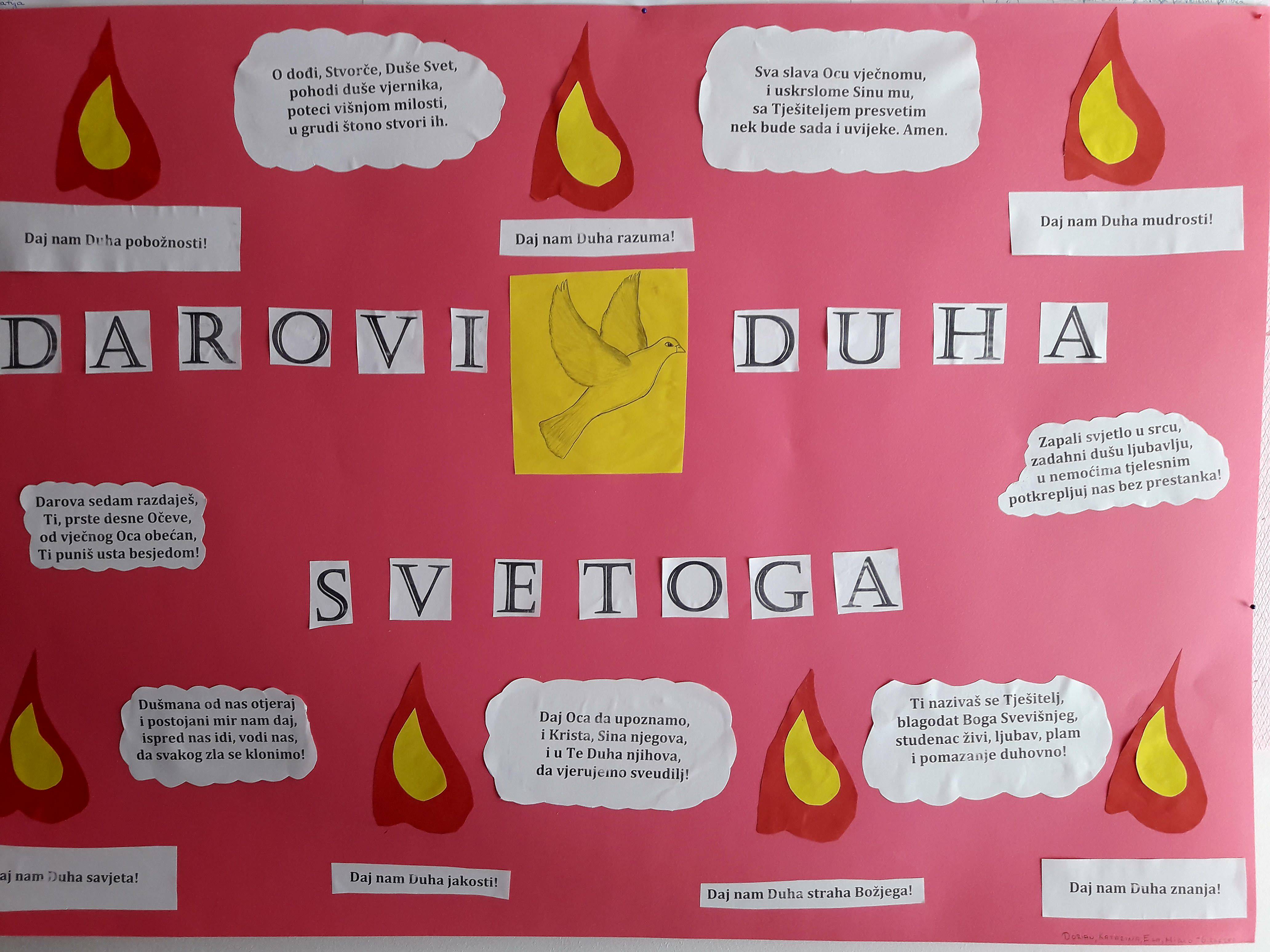 Prigodnim plakatom na temu "Darovi Duha Svetoga" učenici 6. razreda naše škole, članovi izvannastavnih aktivnosti, obilježili su svetkovinu Duhova, poznatiju kao Pedesetnica, kojom je završilo uskrsno liturgijsko vrijeme. U srijedu 16. svibnja učenici su u poslijepodnevnim satima zajedno sa svojim vjeroučiteljem osmislili plakat kojim su ustvari najavili svetkovinu silaska Duha Svetoga.