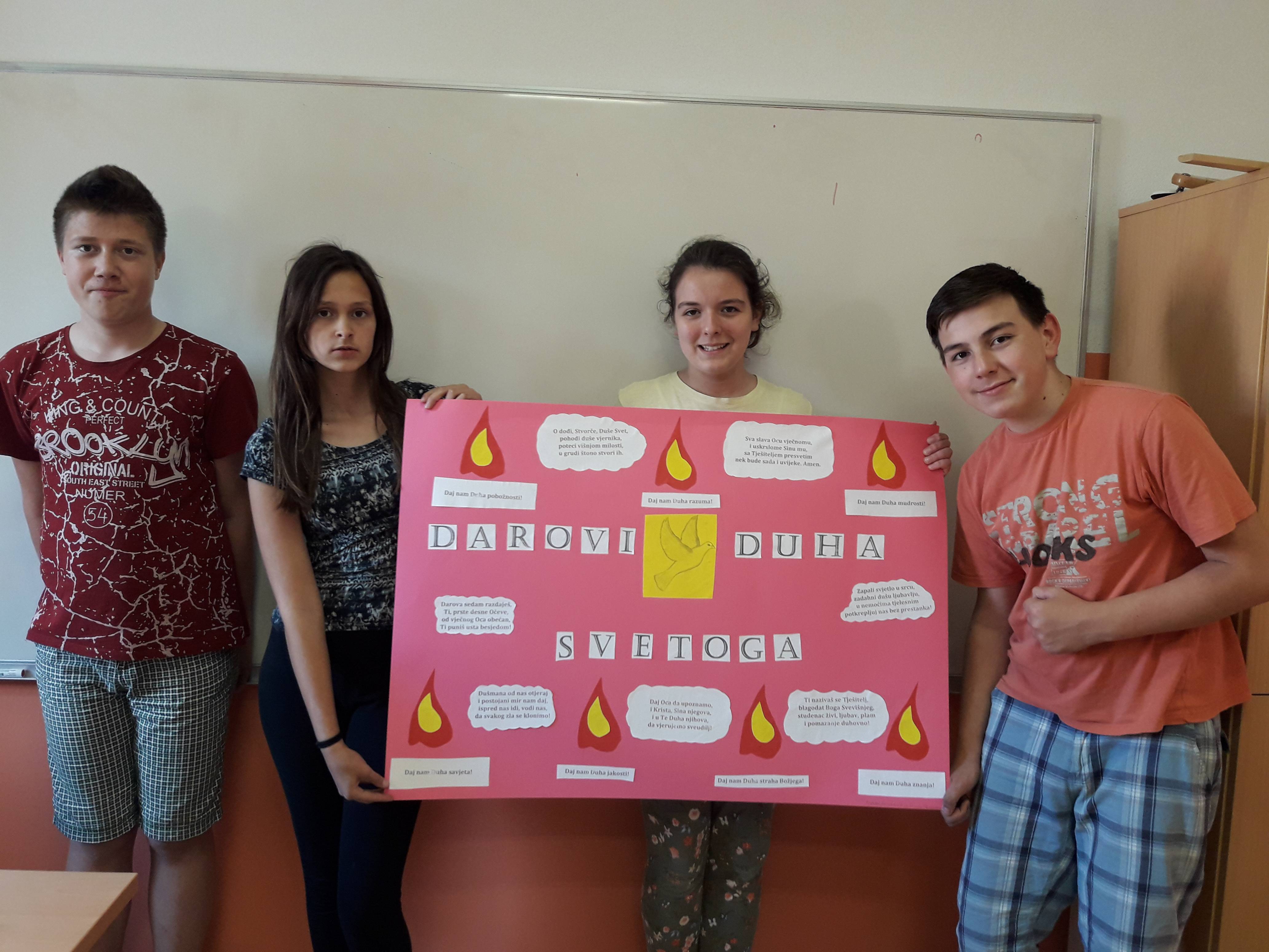 Temeljna misao plakata "Darovi Duha Svetoga" je najpoznatiji himan Duhu Svetome, a u središtu njihova rada prepoznatljiv simbol Duha Svetoga – golubica. Učenici su prikazali i darove Duha Svetoga: mudrost, razum, savjet, jakost, znanje, pobožnost i strah Božji, te svaki taj dar popratno označili plamenom prema biblijskome prikazu silaska Duha Svetoga.