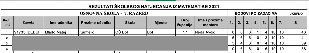 Učenik 7. razreda Osnovne škole Bol, Mlado Matej Karmelić, osvojio je 1. mjesto na školskom natjecanju iz matematike s ostvarenih 43 od mogućih 50 bodova. U konkurenciji od ukupno 229 učenika sedmih razreda osnovnih škola u Splitsko-dalmatinskoj županiji naš učenik bio je najbolji. Pod mentorstvom učiteljice matematike Nede Avdić time je izborio plasman na županijsko natjecanje iz matematike. Mladu i mentorici čestitamo na uspjehu i vjerujemo u jednako dobar rezulatat i na idućoj razini natjecanja.