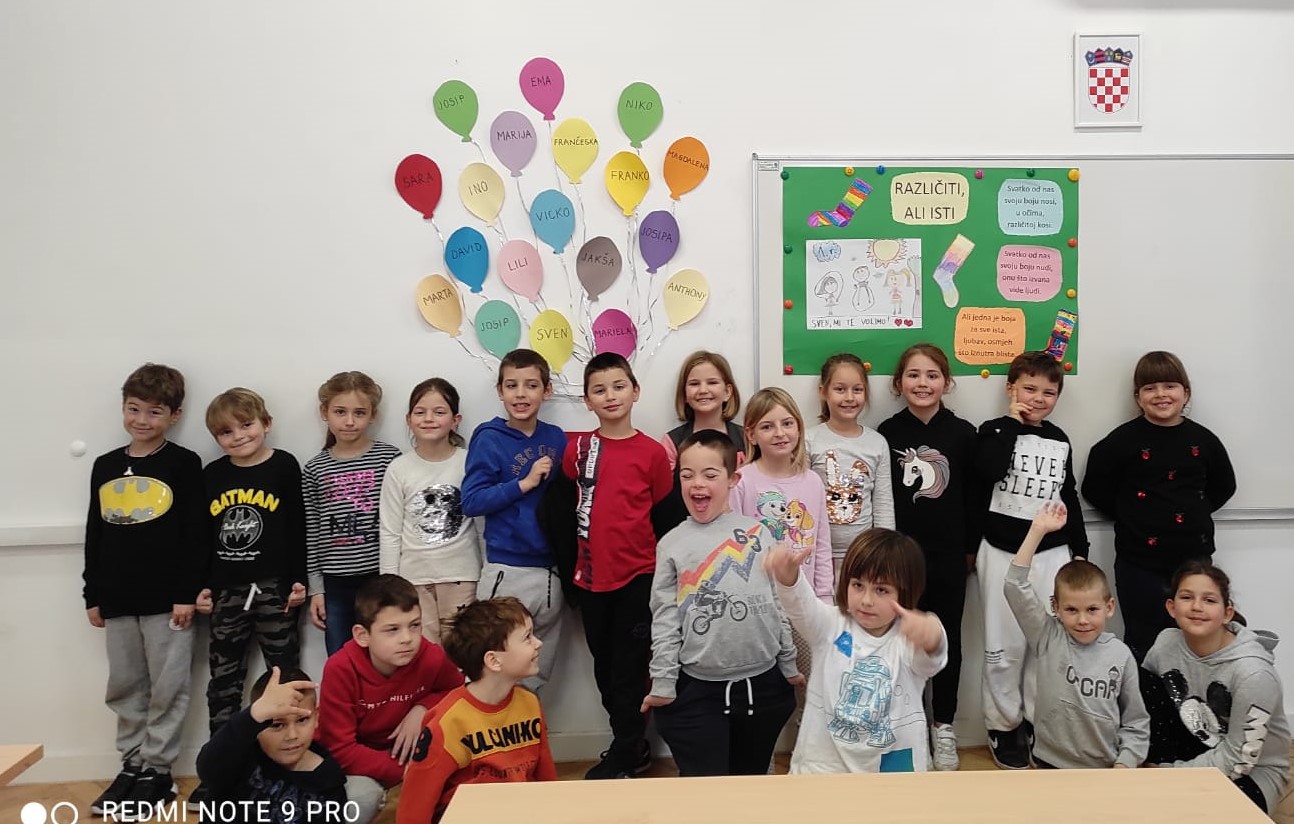 Učenici 1. razreda obilježili su Svjetski dan osoba s Down sindromom. Kako je ovo bio dan našeg učenika Svena, odlučili smo ga uljepšati i učiniti veselim i punim ljubavi. Uz nošenje šarenih, neuparenih čarapa podržali smo osobe s Down sindromom kako bi se što bolje integrirale u društvo. Kako bi pokazali našem Svenu koliko nam je drag i koliko ga volimo, napravili smo slikovnicu u kojoj smo mu crtežima i porukama pokazali da je neizostavan član našeg razreda. Izradili smo i plakate sa prigodnim porukama, a za kraj smo pjevali i plesali.