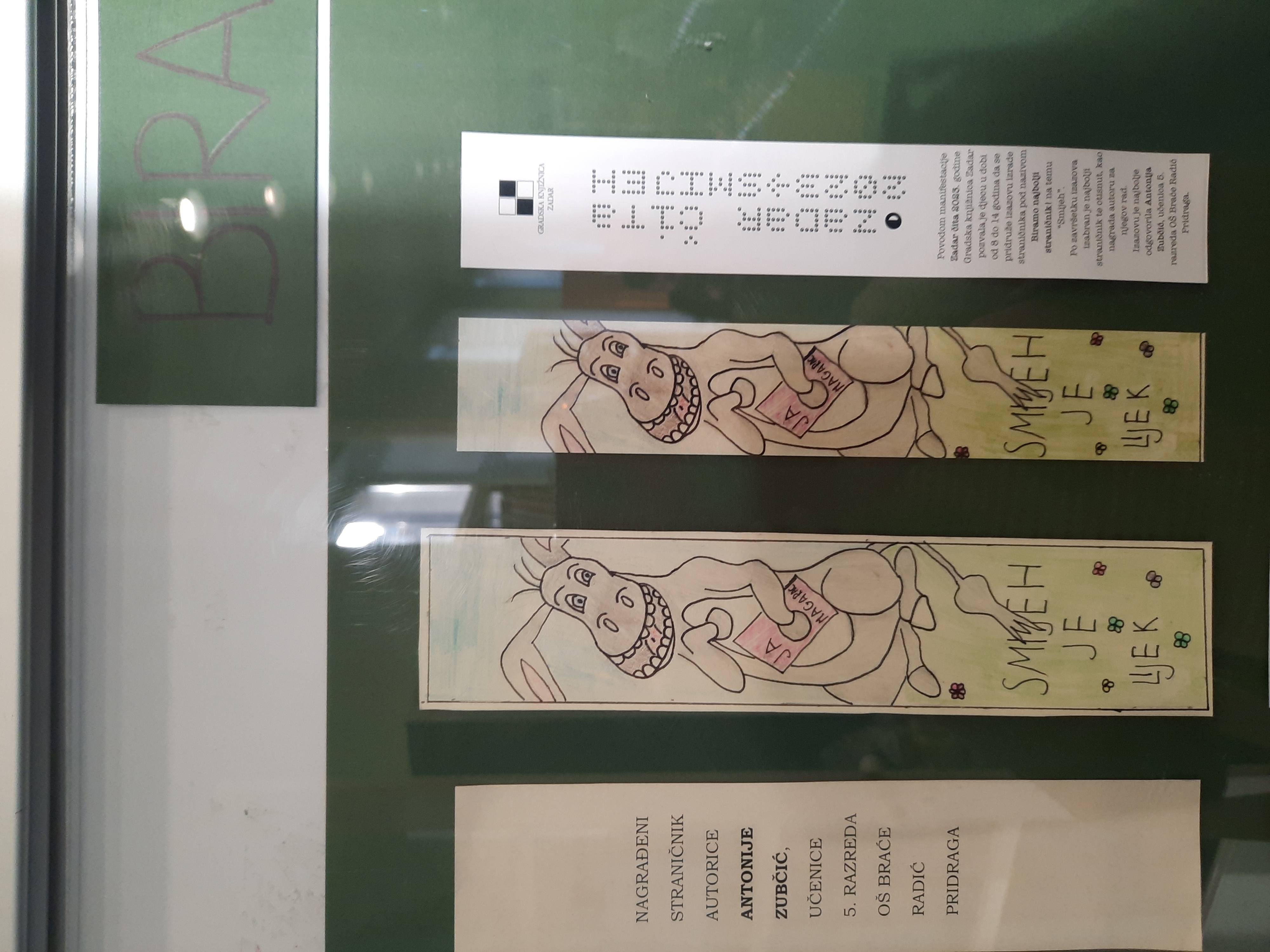Učenice 5.razreda Sofija Radić i Antonija Zubčić te učenice 7. razreda Iva Viduka i Lucija Viduka sudjelovale su u likovnom izazovu izrade straničnika pod nazivom Biramo najbolji straničnik! kojeg je organizirala Gradska knjižnica Zadar. Radovi učenica izloženi su u Gradskoj knjižnici Zadar na dječjem odjelu. Među 66 pristiglih radova izabran je rad učenice Antonije Zubčić te otisnut u 200 primjeraka kao nagrada autorici za ideju i uloženi trud.