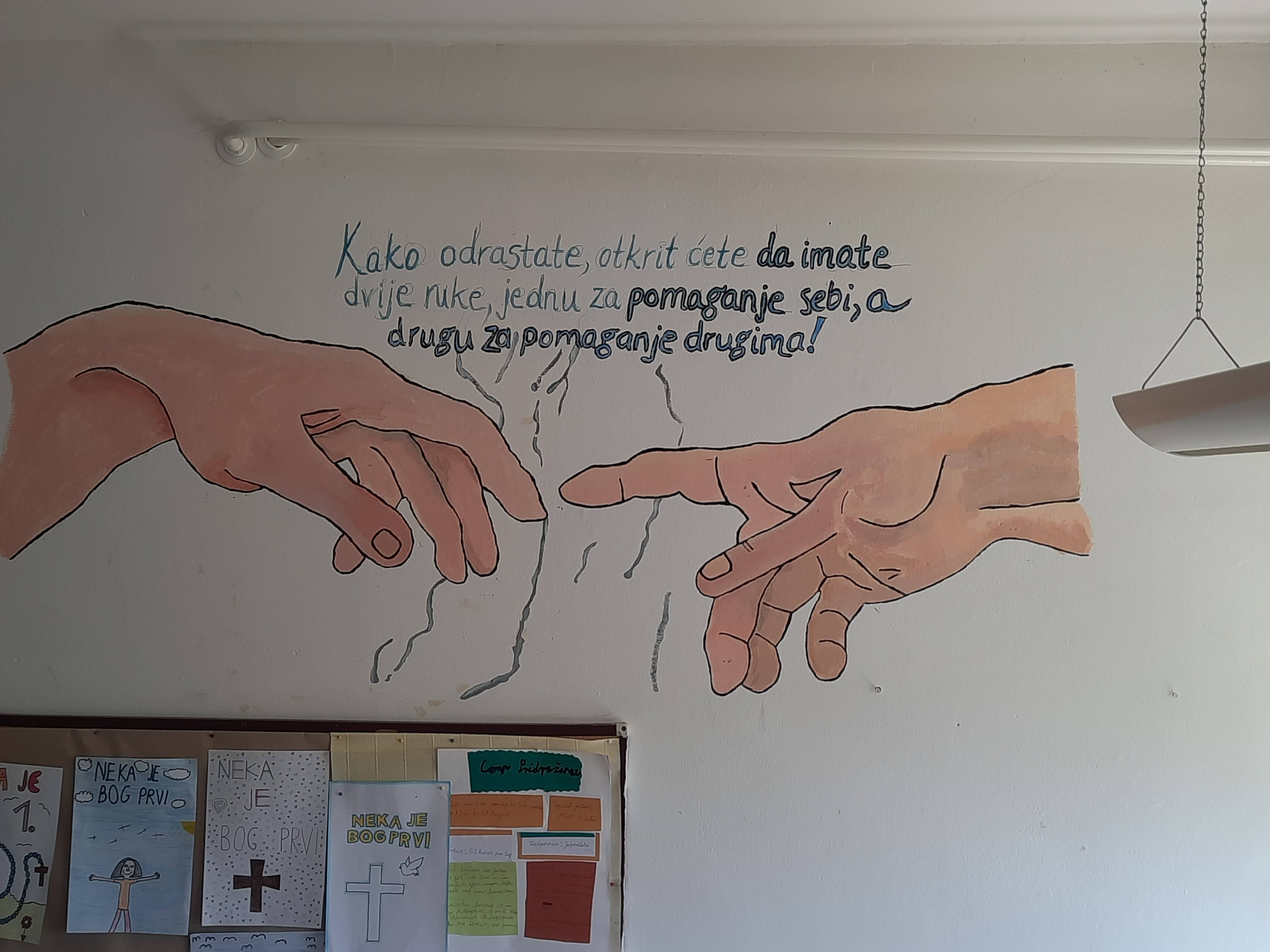 Učenici 7. razreda na zidu svoje učionice oslikali su jedno od najpoznatijih remek – djela svjetske umjetnosti - Michelangelovo Stvaranje Adama. Naučili su da je Stvaranje Adama značajno renesansno djelo koje je 1511. godine na stropu Sikstinske kapele, koja se nalazi u sklopu Vatikanske palače u Rimu, oslikao poznati talijanski umjetnik Michelangelo. Stvaranje Adama prizor je kojim je umjetnik prikazao vlastito viđenje stvaranja svijeta u kojem su prikazani Bog i Adam, čije se ispružene ruke istežu jedna prema drugoj.
