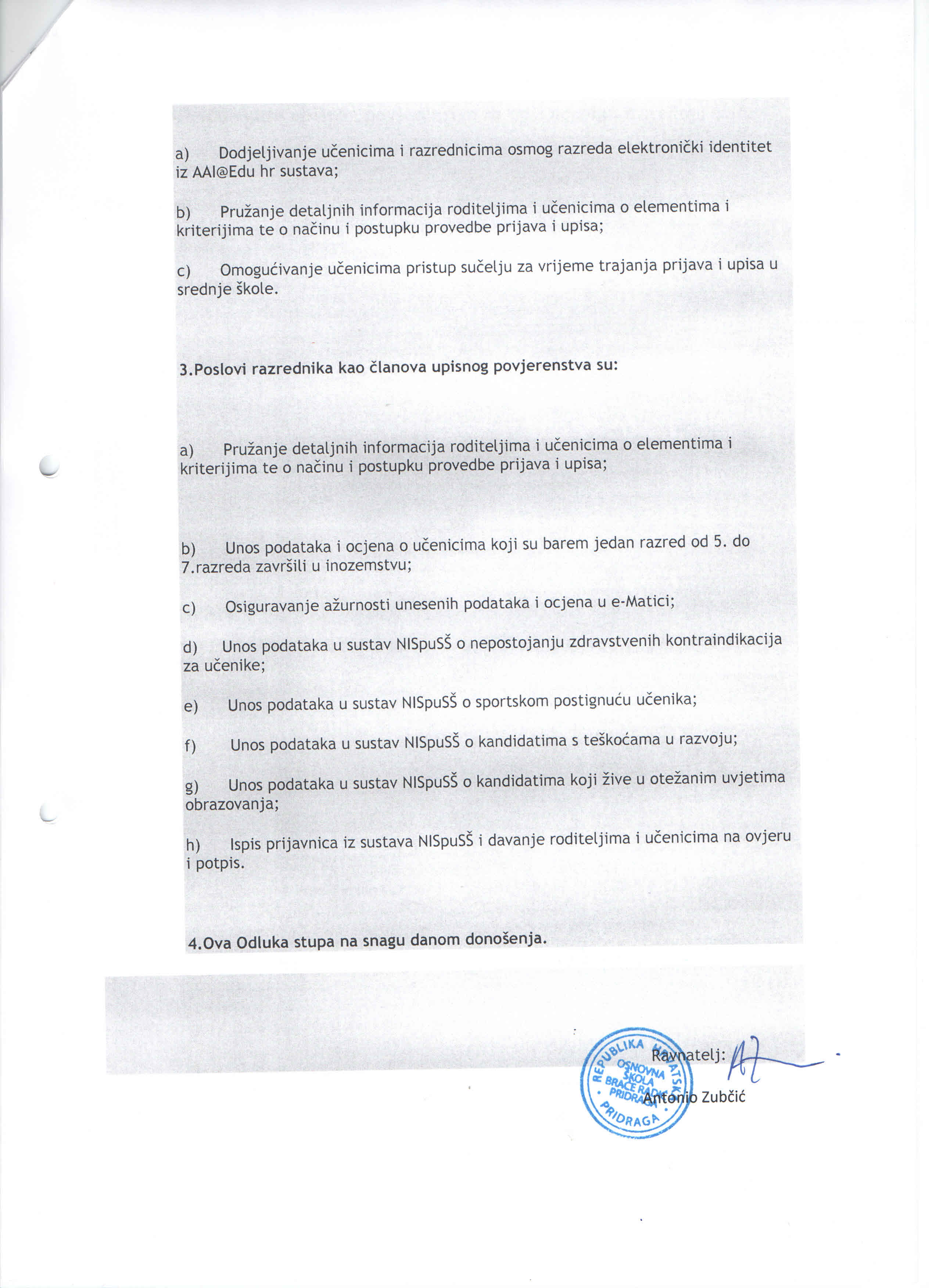 a) Antonio Zubčić, ravnatelj, predsjednik upisnog povjerenstva