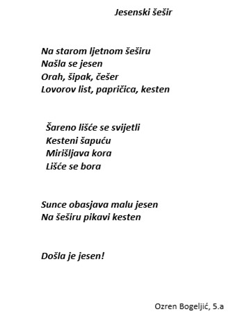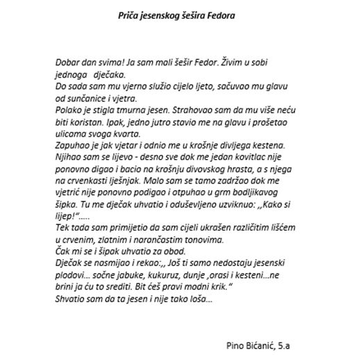 Priča jesenskog šešira mjesečni je projekt u kojemu su sudjelovali učenici 5.a i 5.b razreda u sklopu nastave Hrvatskoga jezika. Svaki učenik je za svoj jesenski šešir napisao priču, igrokaz ili pjesmicu. Na satu predviđenom za prezentiranje radova, učenici su čitali svoje sastavke i prezentirali kreativne jesenske šešire.