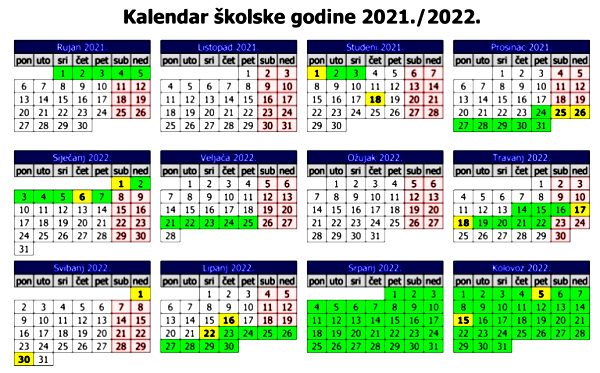Nastavna godina počinje 6. rujna 2021. godine, a završava 21. lipnja 2022. godine.