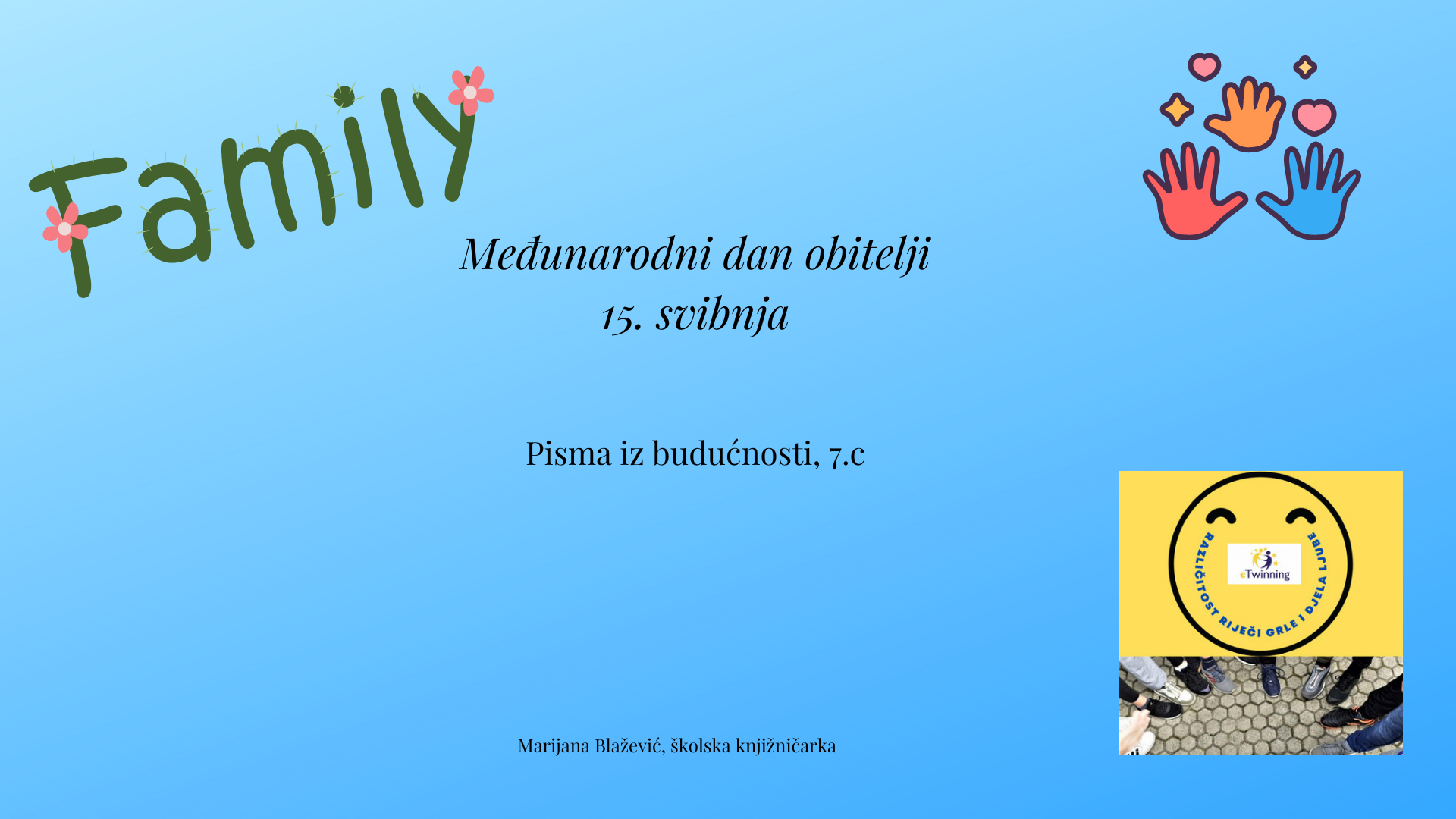 Učenici 7.c razreda obilježili su Međunarodni dan obitelji u školskoj knjižnici. Nakon uvodnog razgovora što za njih znači obitelj i tko je sve njihova obitelj učenici su imali zadatak napisati pismo. Pismo iz budućnosti pisali su sebi ili svojoj obitelji. Zamislili su sebe kao izgrađenu osobu koja je završile školu, osnovala svoju obitelj i pronašla posao. Neki su proputovali cijeli svijet, imaju obitelj i posao koji vole. U pismima su otkrili svoju emotivnu stranu i pokazali koliko im je važna njihova obitelj.