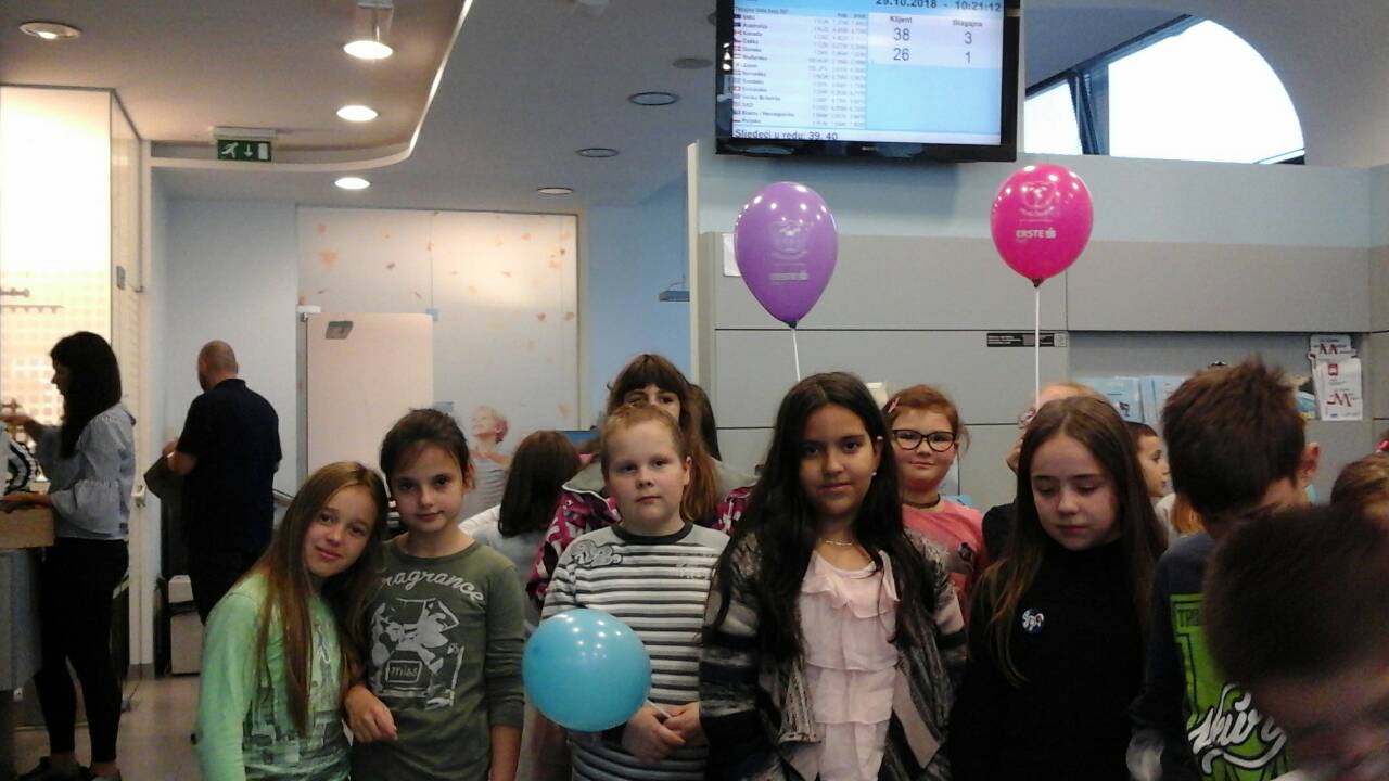 Ljubazni domaćini su nas ugostili u svome prostoru i otkrili nam tajne bankarskoga poslovanja. Tako su učenici u prostorijama banke, uz stručno vodstvo djelatnika, otkrivali tajne čuvanja, posuđivanja i štednje novca ( naravno, danas kroz teoriju, a sutra, tko zna ?!) Osim detaljnim i primjerenim informacijama, bankari su naše četvrtaše i učenike posebnih odjela nagradili bedževima, bilježnicama i balonima s tematskim obilježjima dječje štednje. Hvala im !