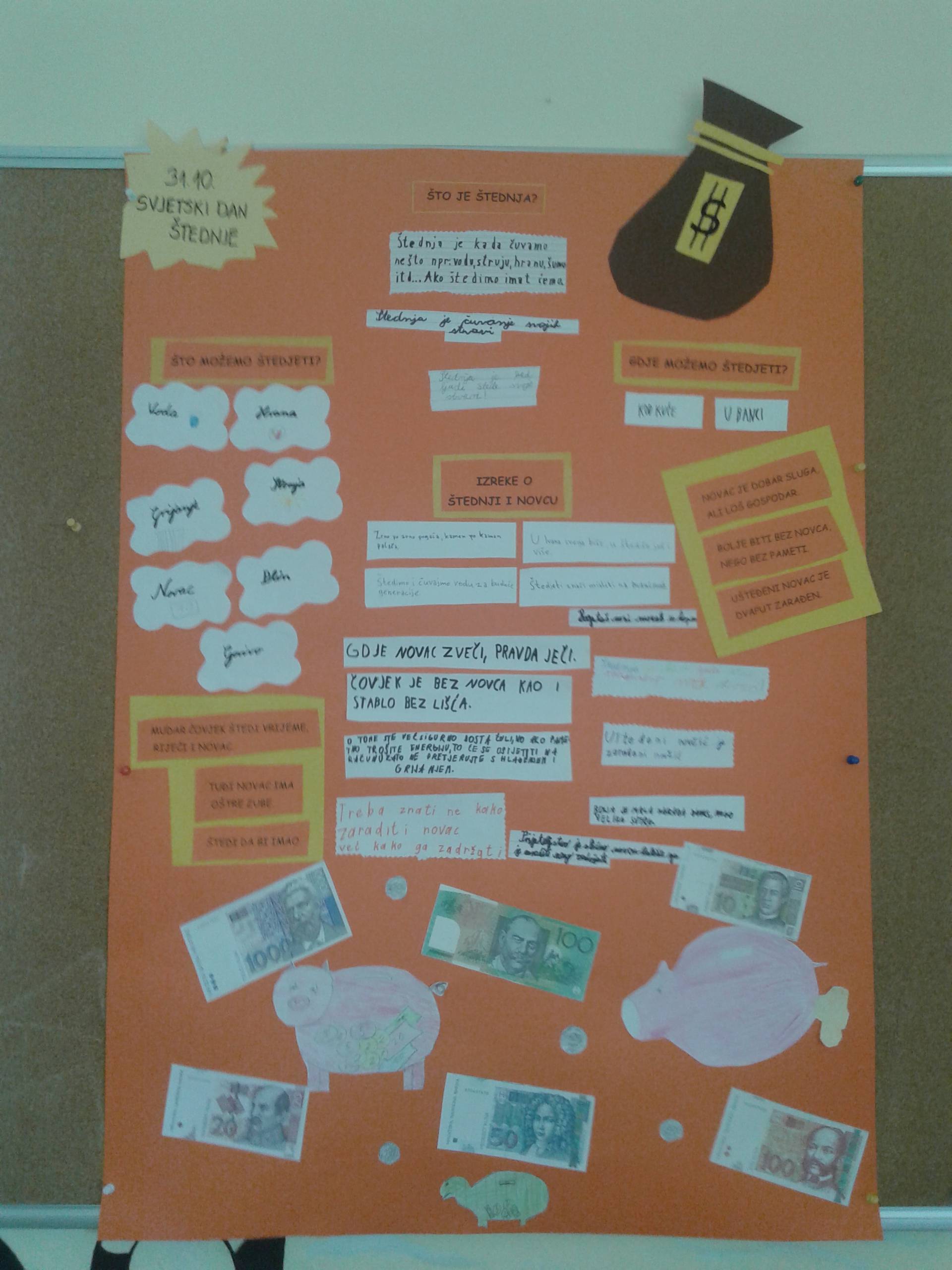 Na naš zajednički plakat napisali smo puno izreka o štednji. Neke od njih su: Čovjek bez novca je kao stablo bez lišća, Ušteđeni novčić je zarađeni novčić, Tuđi novac ima oštre zube.. Crtali smo kasice i lijepili sličice novca. Naučili smo što se sve može štedjeti. Svjetski dan štednje obilježava se 31.listopada.