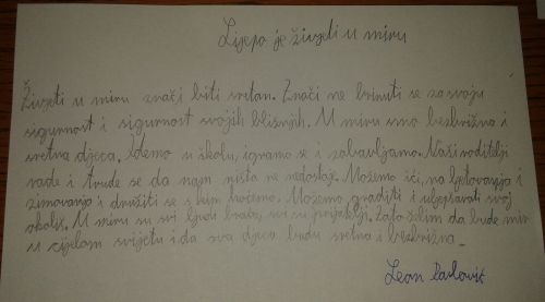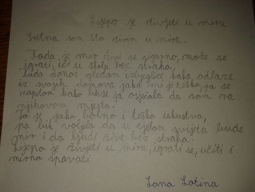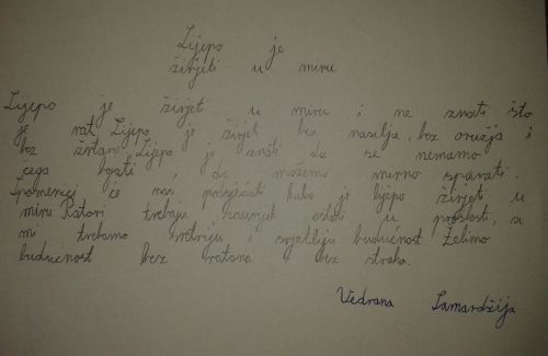 U grupnom obliku rada upoznali su kulturno-povijesne spomenike grada i izradili najpoznatije simbole grada, vukovarski vodotoranj i vučedolsku golubicu. Na samom kraju sata čitali su sastavke na temu „Lijepo je živjeti u miru“. Sastavcima i likovnim radovima uredili su razredni pano. Sve aktivnosti planiranog sata odrađene su s dostojanstvom i ponosom prema svim žrtvama Domovinskog rata.
