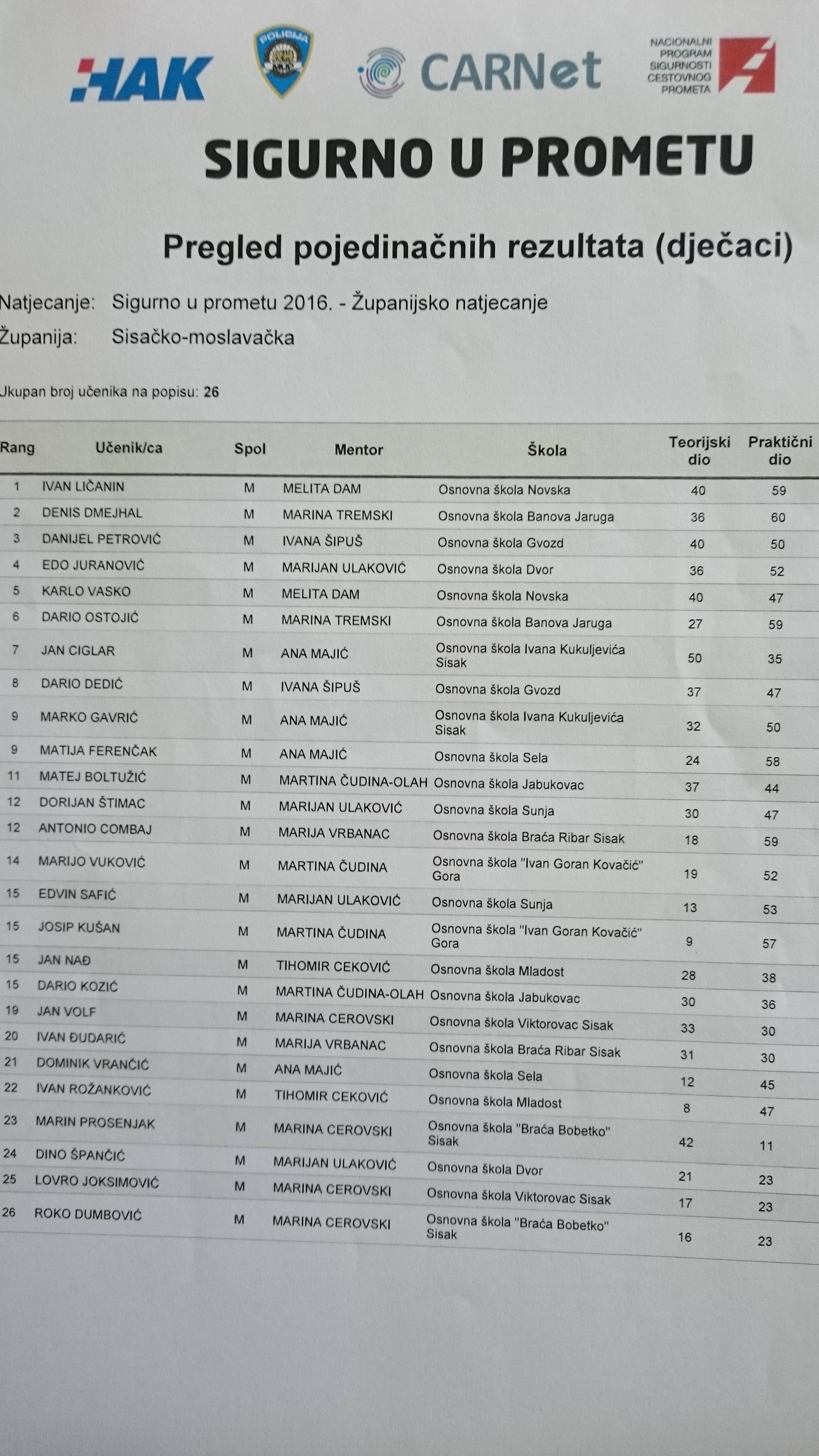 Našu školu predstavljali su učenici Eva Budak, Katarina Mlađenović, Dino Špančić i Edo Juranović. Ukupno se natjecalo 52 učenika: 26 dječaka i 26 djevojčica.