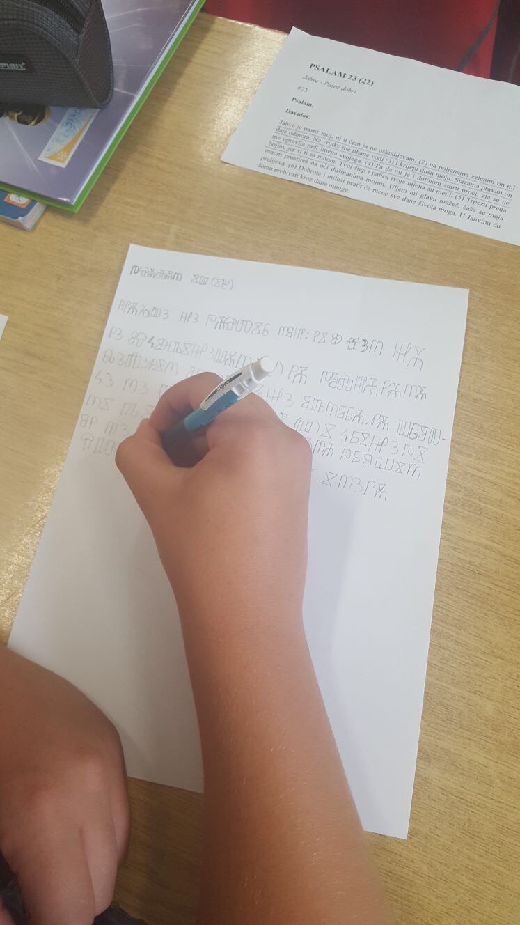Nakon kraćeg uvoda u kojem su se učenici mogli upoznati s dostupnim podacima o pismenosti ljudi u svijetu, zaključili su kako su privilegirani budući je još uvijek veliki broj ljudi u svijetu, nažalost, nepismen. Također smo tijekom kratkog razgovora spoznali koliko je pismenost danas puno širi pojam jer osim temeljnog – pisanja i čitanja, danas je iznimno važna i informatička pismenost. Na kraju smo u molitvi iskazali zahvalnost svim učiteljima naše škole, ali i svim učiteljima na svijetu koji poučavaju i na taj način prenose svijetlo znanja i novih spoznaja. Učenici su ulomke psalama prepisivali na glagoljici, razvijajući pri tom svijest o važnosti očuvanja od zaborava tog starog hrvatskog pisma.