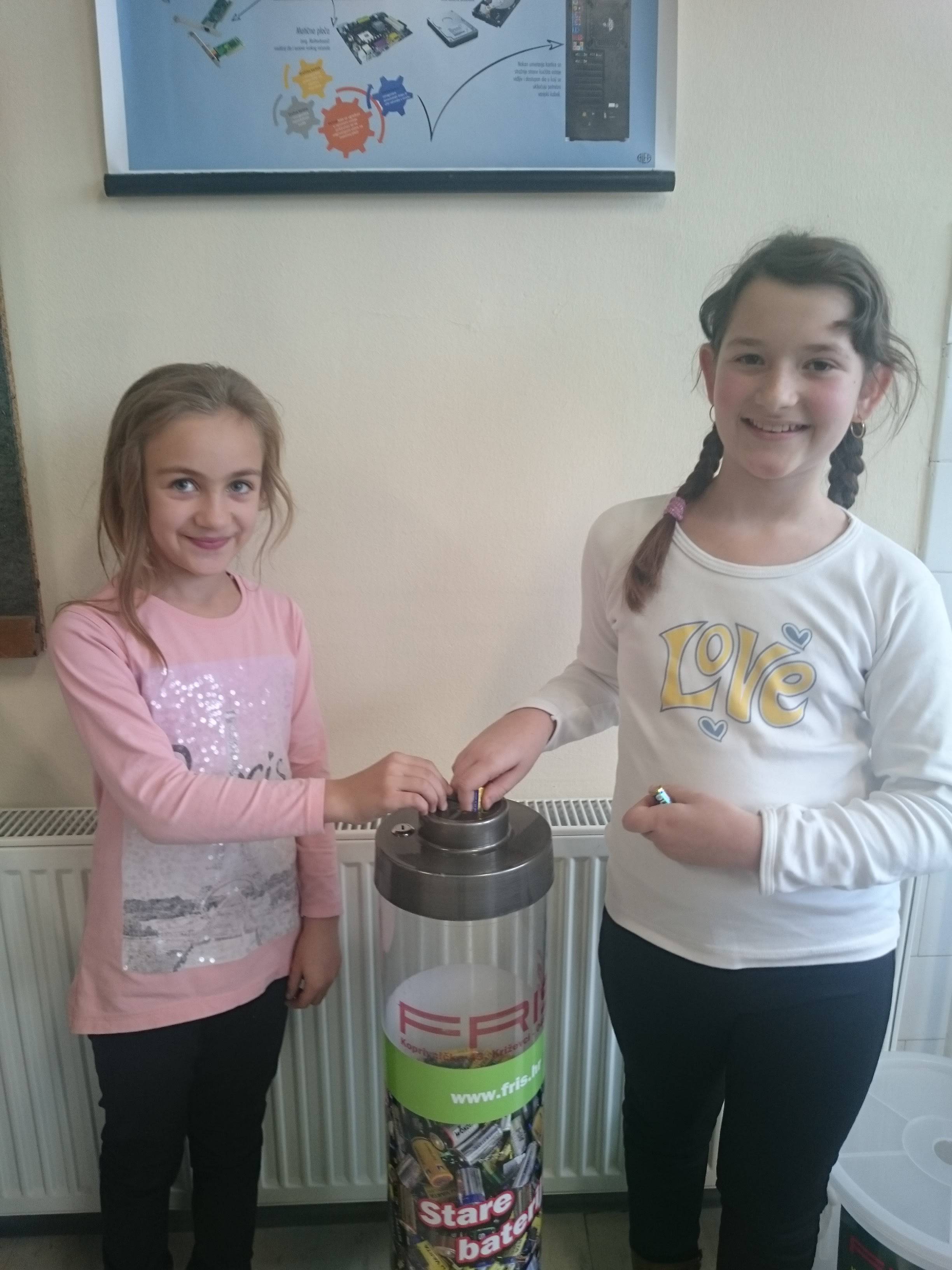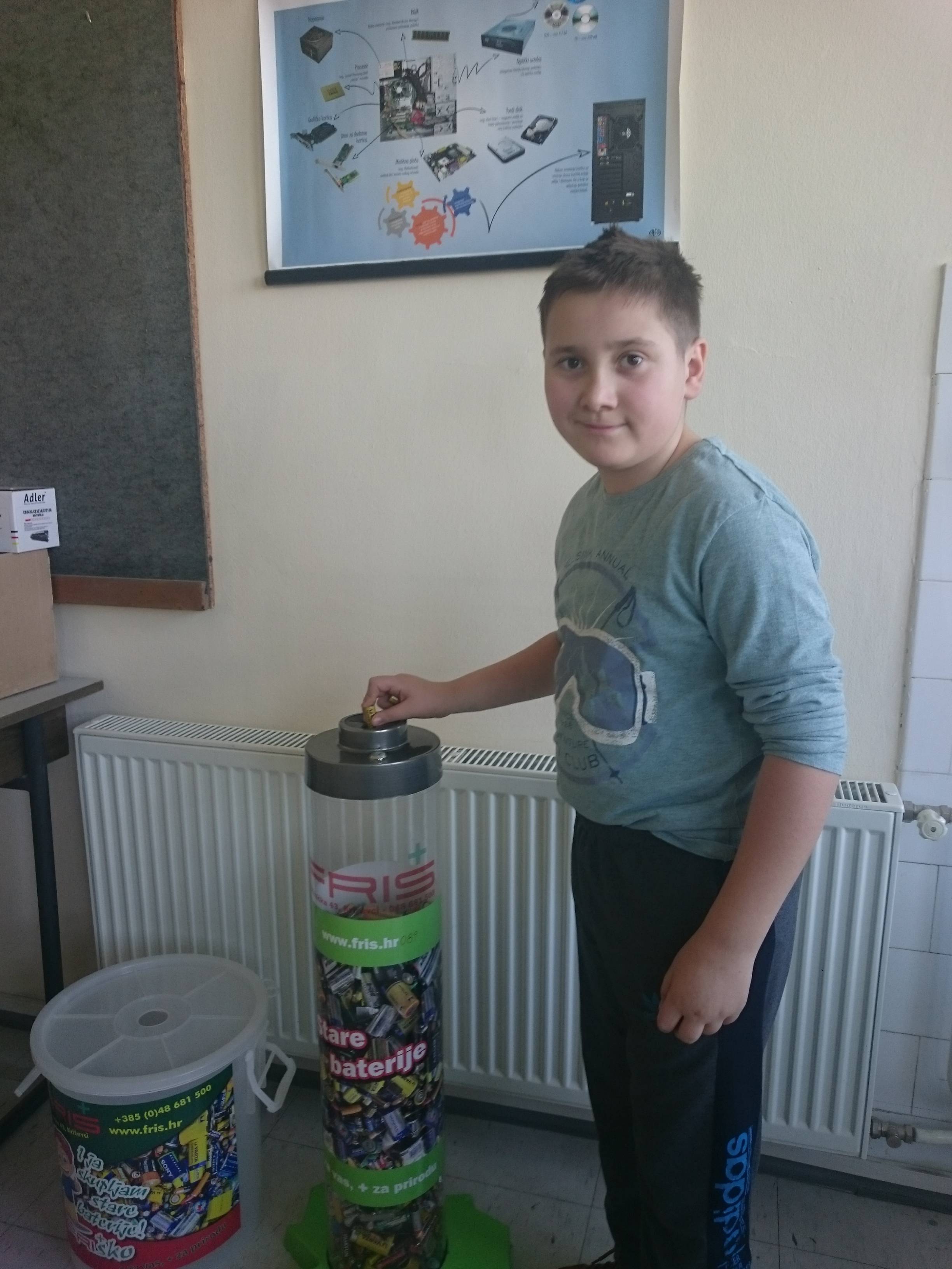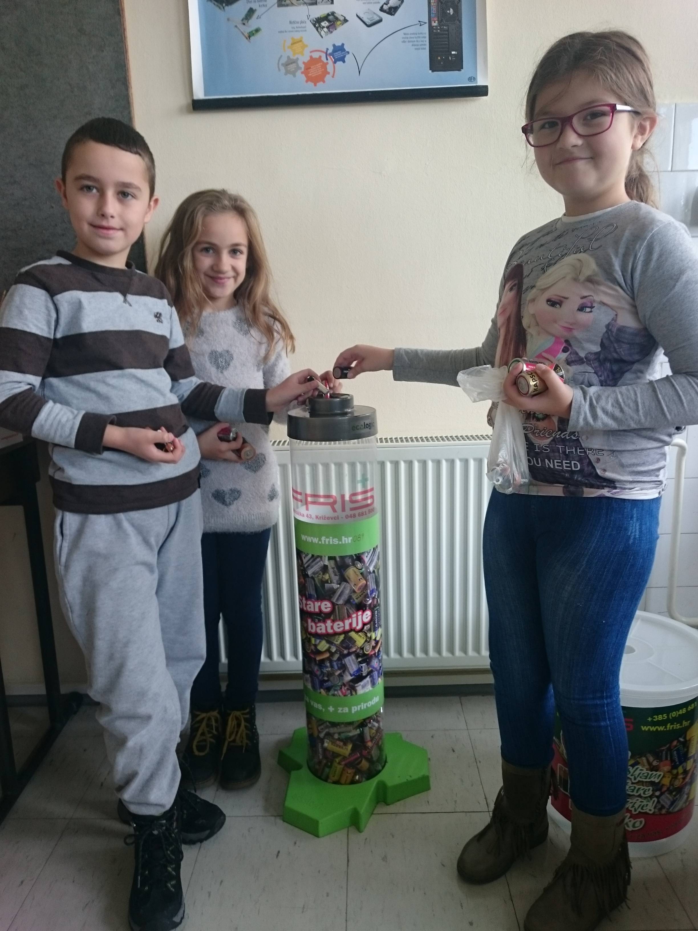 Prema istraživanju koje smo proveli u školskoj godini 2016./2017. u projektu “Zbrinjavanje e-otpada u općini Dvor” stare baterije najčešće završavaju u prirodi ili komunalnom otpadu. Zakonom o zaštiti okoliša propisano je da se i stare baterije moraju odlagati odvojeno od komunalnog otpada. U našoj školi (u kabinetu informatike) postavili smo spremnike u koje odlažemo stare baterije koje prikupimo. Na kraju nastavne godine firma Friš d.o.o. doći će u školu isprazniti spremnike. Nihov zadatak je osigurati odgovarajući Prateći list za otpad koji je po Pravilniku o baterijama i akumulatorima obavezan i preuzeti baterije na poziv.