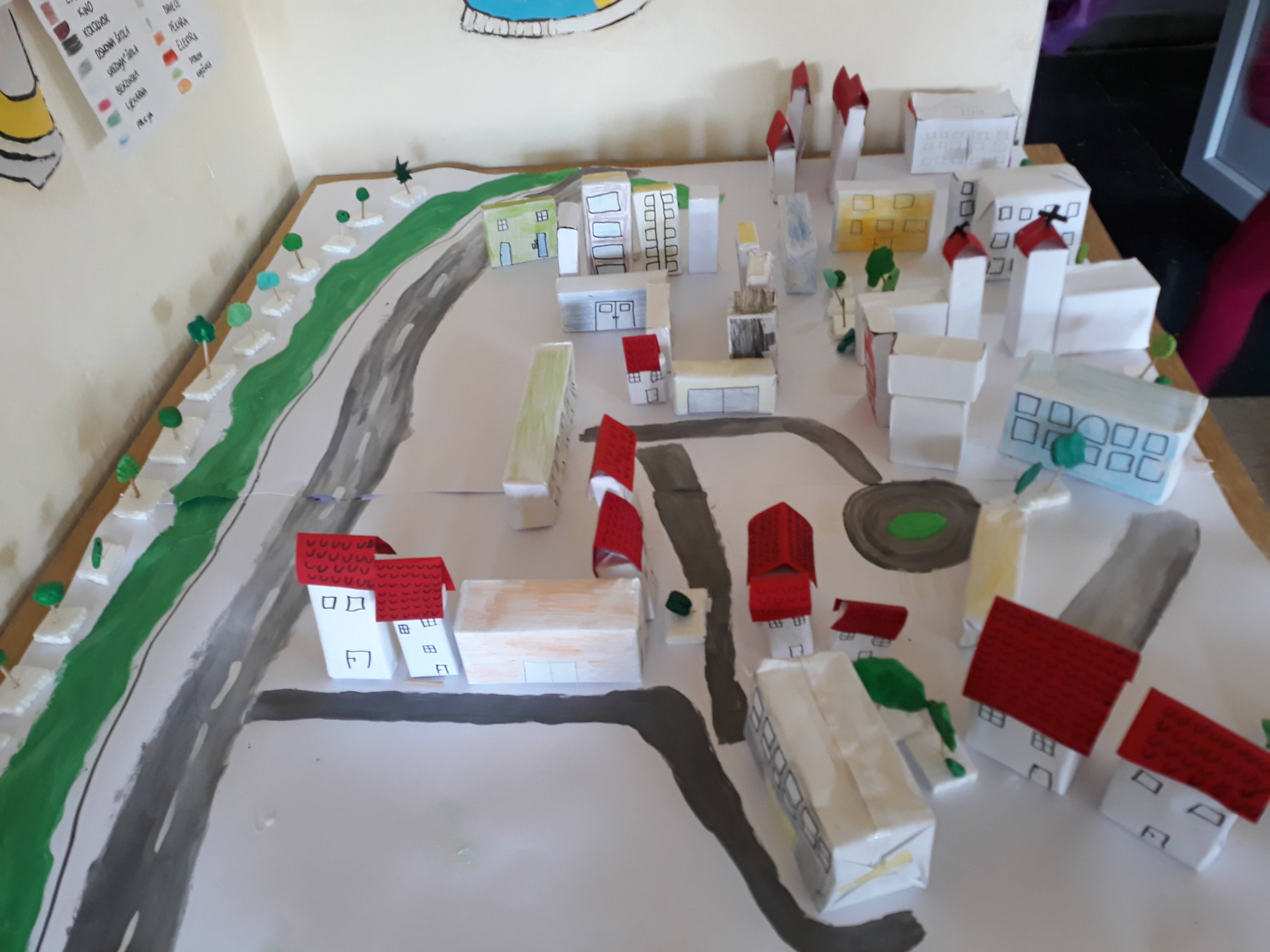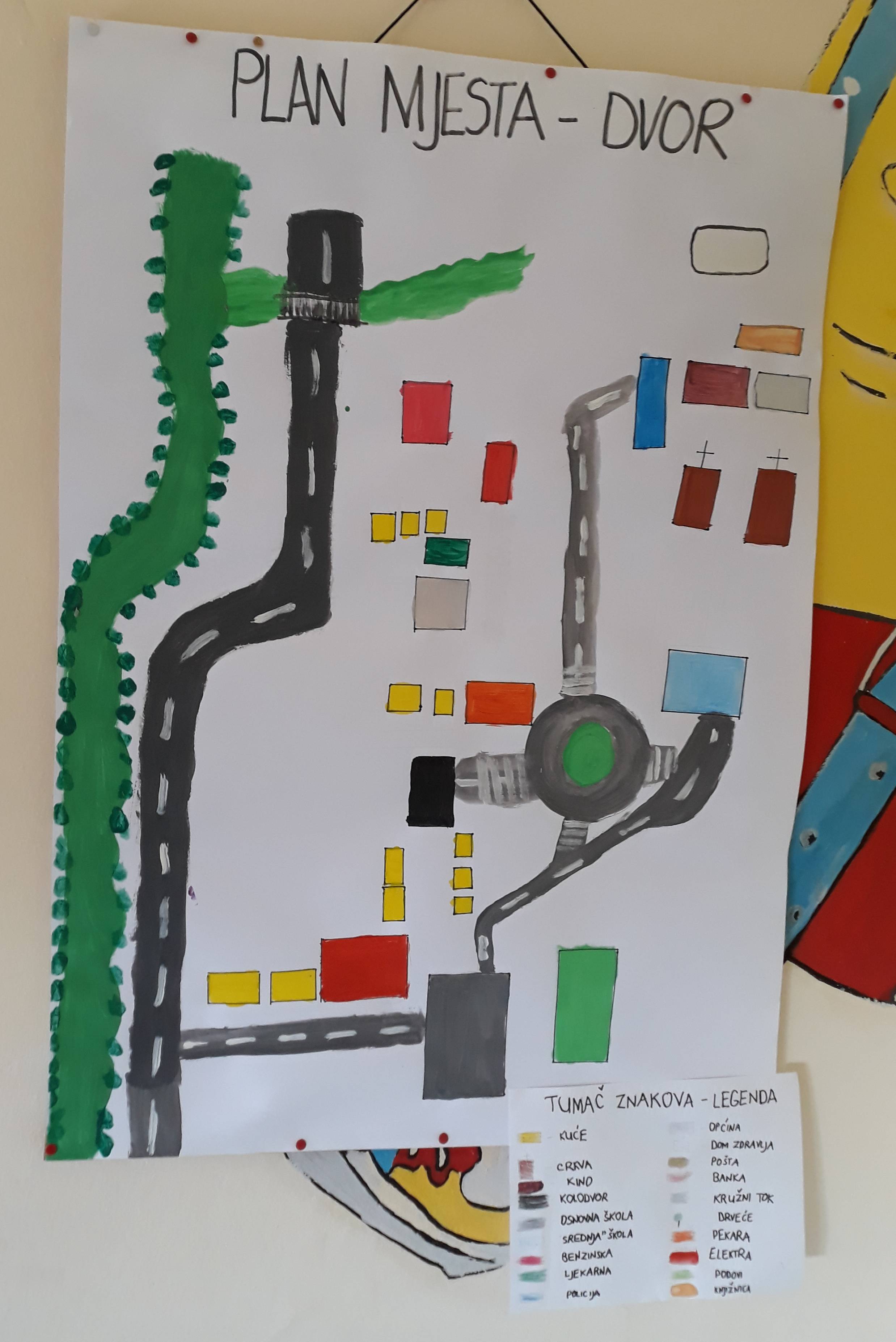 Na satu prirode i društva izradili smo plan Dvora i maketu. Od kutijica smo napravili školu, poštu, dom zdravlja, ljekarnu, stambene zgrade i kuće. Od plastelina smo oblikovali drveće. Cestu smo obojali sivom temperom. Od crvenog papira smo napravili krovove.