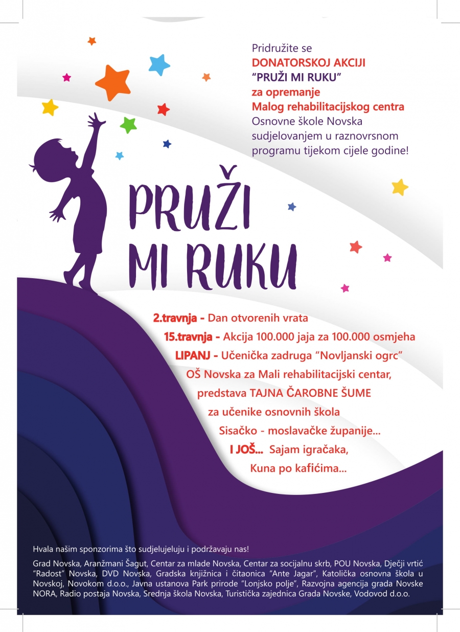 Humanitarna akcija  "Pruži mi ruku" organizirana je u cilju prikupljanja donacija kako bi se uredio Mali rehabilitacijski centar u Novskoj. Sve škole u našoj  županiji su se uključile u akciju tako da svaki učenik oslika jednu pisanicu koja će se kasnije prodavati. Njihovom prodajom će se prikupljati sredstva za opremanje Rehabilitacijskog centra kako bi se osigurao smještaj djeci s poteškoćama u razvoju s najsuvremenijom didaktičkom opremom i kako bi imali adekvatnu rehabilitacijsku pomoć. U akciju su se uključili svi učenici naše škole i naša UZ Una.
