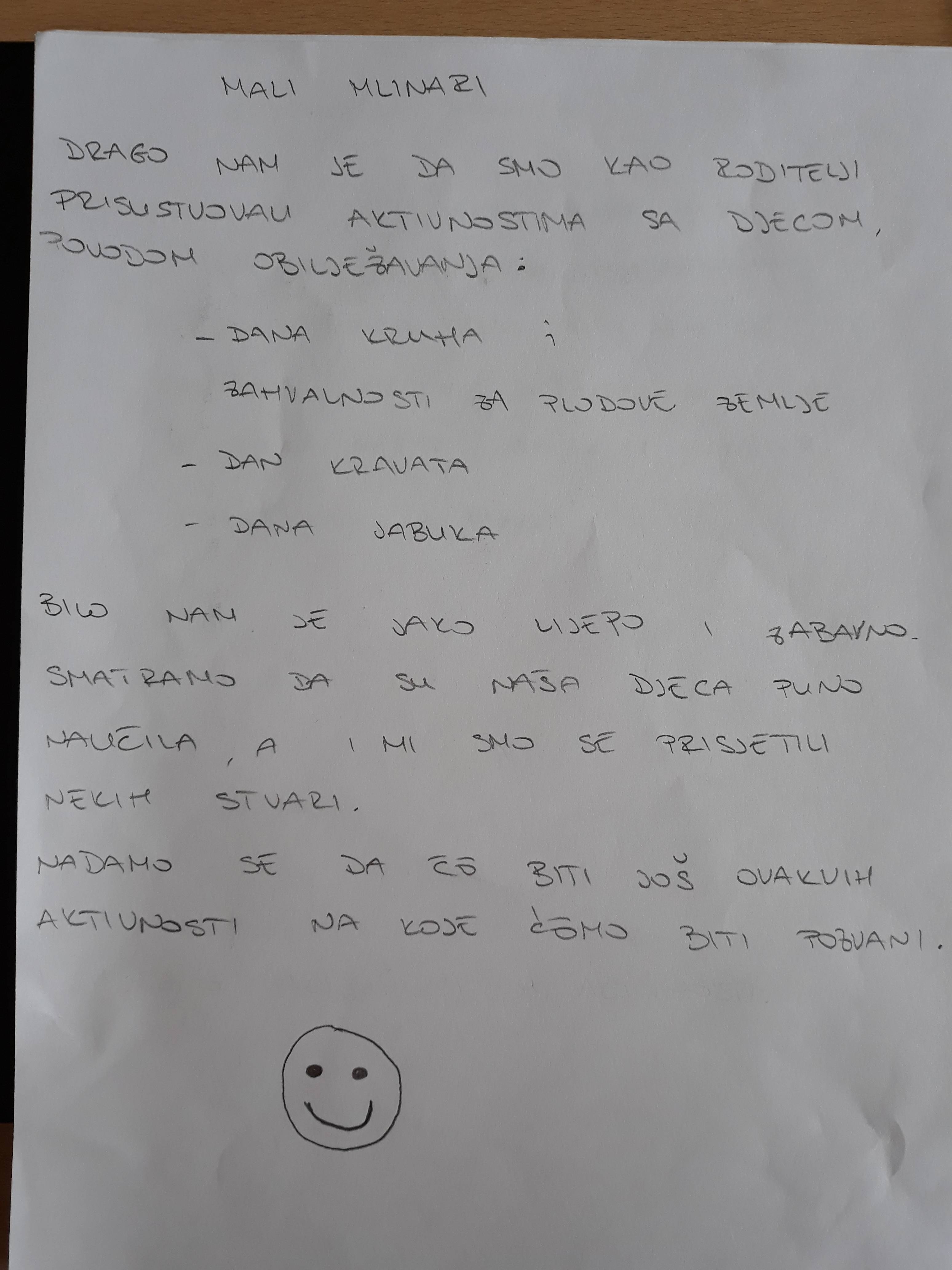Učenici su na nastavu došli s kravatama, a djevojčice su imale vezane marame kao kravate. Na početku su roditeljima pokazali svoje vještine glume u narodnoj priči  Zrno pšenice. Uz pokrete su pjevali pjesmicu Mlin. Nakon veselog uvoda, roditelji i djeca su u četiri skupine dobili zadatke koje su trebali u zadanom vremenu riješiti.  Poslije su skupine Pčelica Maja, Mali mlinari, Super kreativci i Kravata prezentirali svoje uratke.