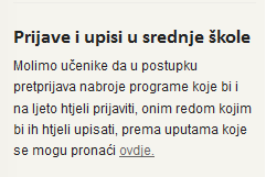 Svi učenici osmih razreda u razdoblju od 2. do 22. prosinca 2013. godine trebaju u predprijavi na stranici Nacionalnoga informacijskog sustava prijava i upisa u srednje škole iskazati svoj interes za upis u pojedine programe.