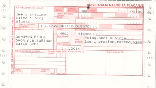 Od učitelja/razrednika dobili ste primjer kako uplatnicu treba popuniti, a primjer možete vidjeti i na slici u privitku. Za svaki mjesec upišite odgovarajući iznos, podatke o djetetu i za svaki mjesec u rubrici “Poziv na broj primatelja” mijenjate broj mjeseca (npr. 01-2014 za siječanj, 02-2014 za veljaču, 03-2014 itd.)
