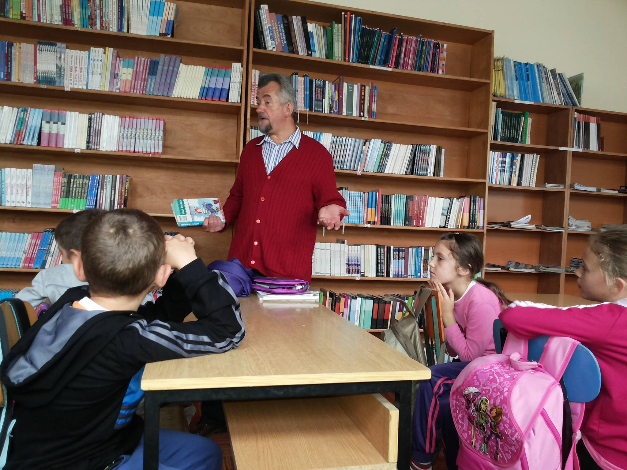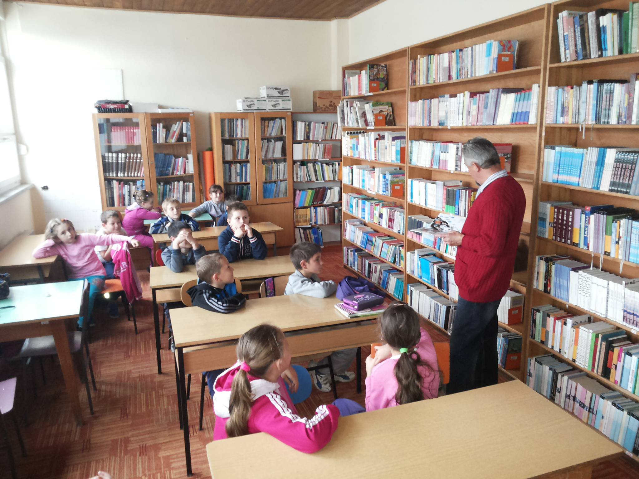 Povodom mjeseca knjige, posjetili smo školsku knjižnicu u matičnoj školi. Učenici su upoznali knjižničara i predočen im je način posuđivanja knjiga. Učiteljice su izabrale nekoliko kratkih priča koje su pročitale učenicima. Kako je glavna tema Mjeseca knjige ljubav, priče su govorile o ljubavi. I naš knjižničar, gosp. Mato Barić pročitao je učenicima nekoliko šaljivih pjesmica.