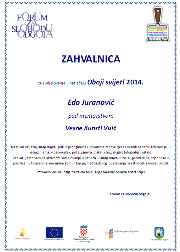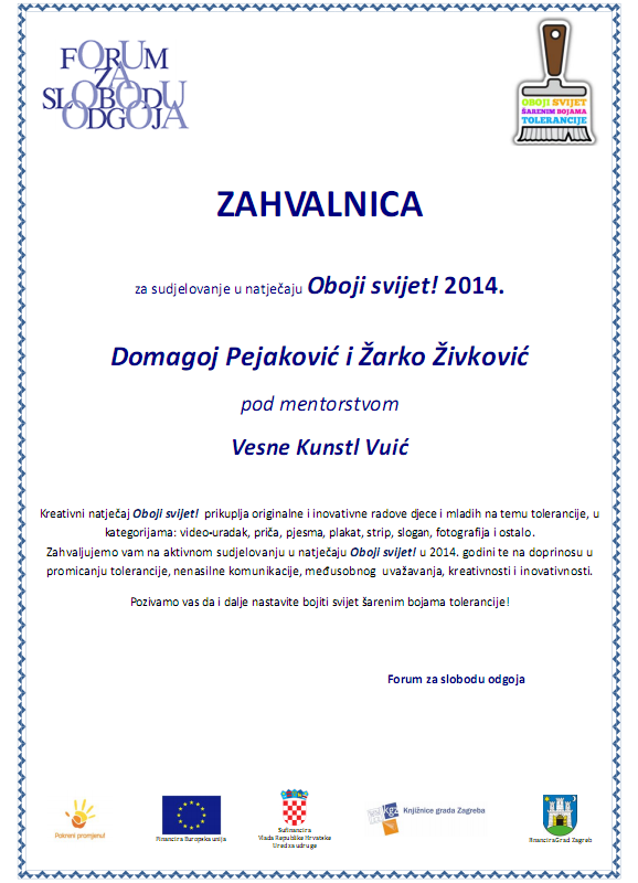 Učenici četvrtog razreda pod mentorstvom učiteljice Vesne Kunstl Vuić dobili su nagradu Foruma za slobodu odgoja za sudjelovanje u natječaju Oboji svijet! 2014.