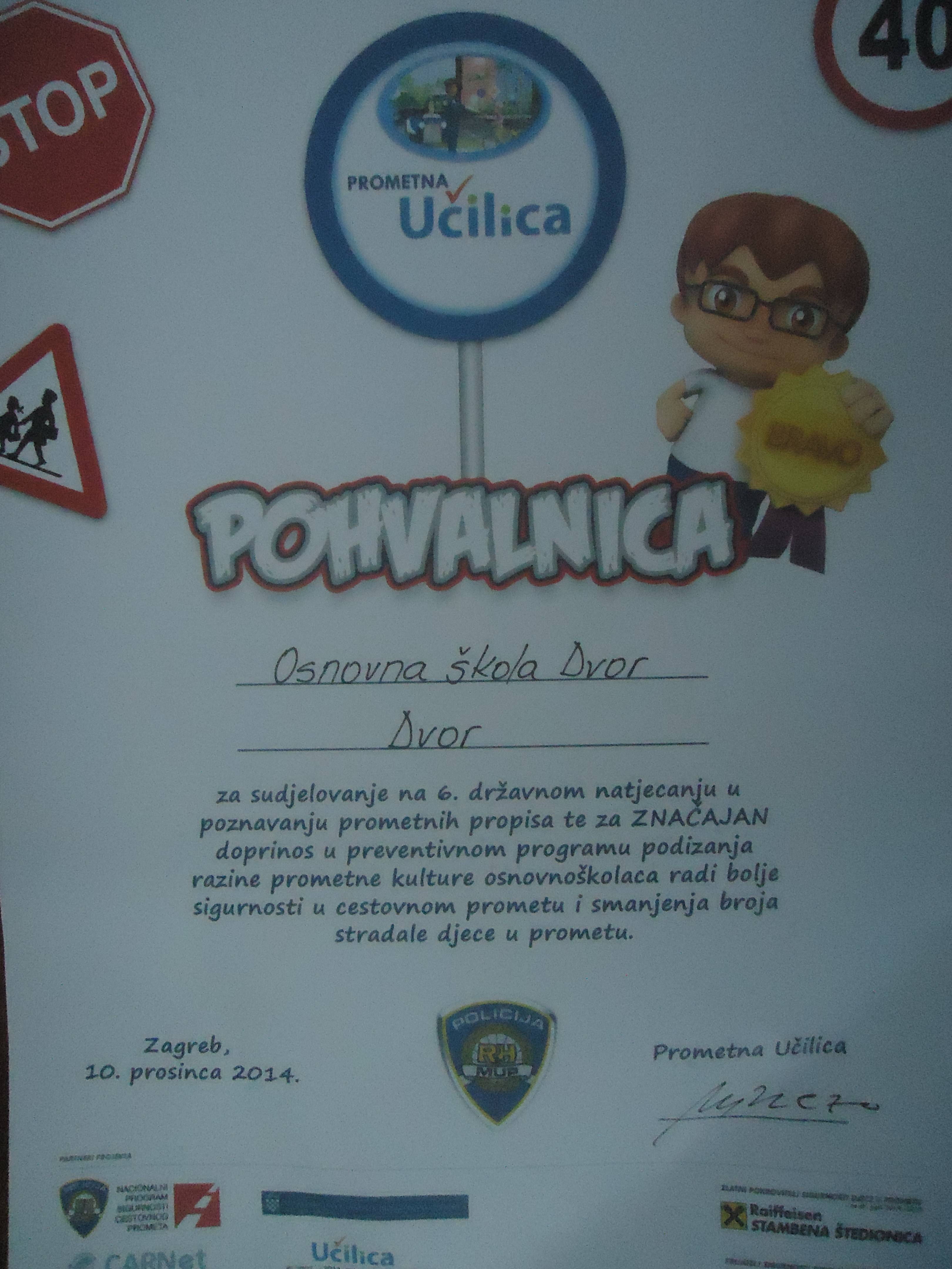 Učenici OŠ Dvor sudjelovali su na 6. državnom natjecanju u poznavanju prometnih propisa pod mentorstvom učitelja tehničke kulture Marijana Ulakovića. Na natjecanju je sudjelovalo 7525 učenika iz 270 škola, a iz naše škole najbrojniji su bili učenici 4. i 5. razreda.