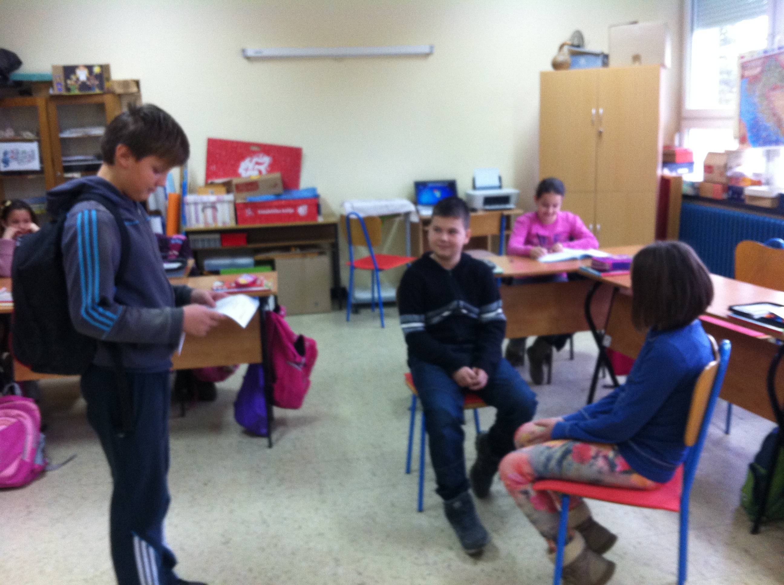 Na satu hrvatskog jezika glumili smo kako naši roditelji reagiraju na negativnu ocjenu. Podijelili smo se u skupine po četiri učenika koji su glumili roditelje, učiteljicu i učenika koji je dobio jedinicu.