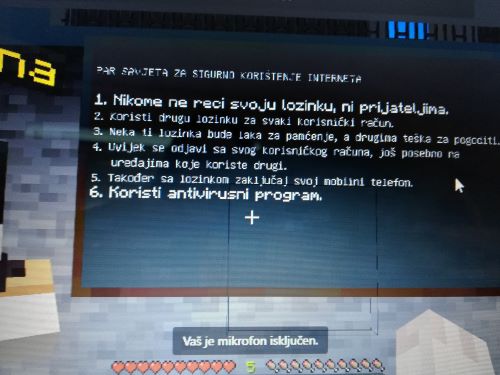 Ove godine Dan sigurnijeg interneta, 11.2.2020., obilježili smo natjecanjem u Minecraft Education Editionu i poznavanju tema vezanih uz sigurnost na internetu u kojem su sudjelovali učenici iz 8 škola. Ekipa naše škole osvojila je 1. mjesto. Domaćin ovog virtualnog natjecanja bila je OŠ Popovača, a pokrovitelj Microsoft Hrvatska.