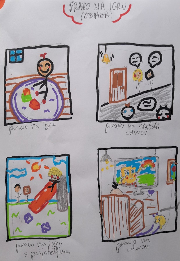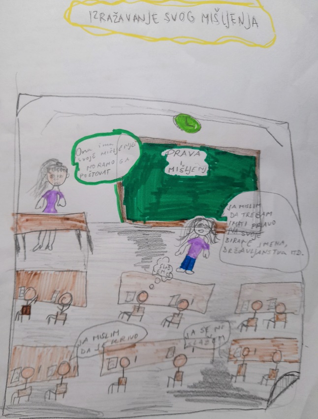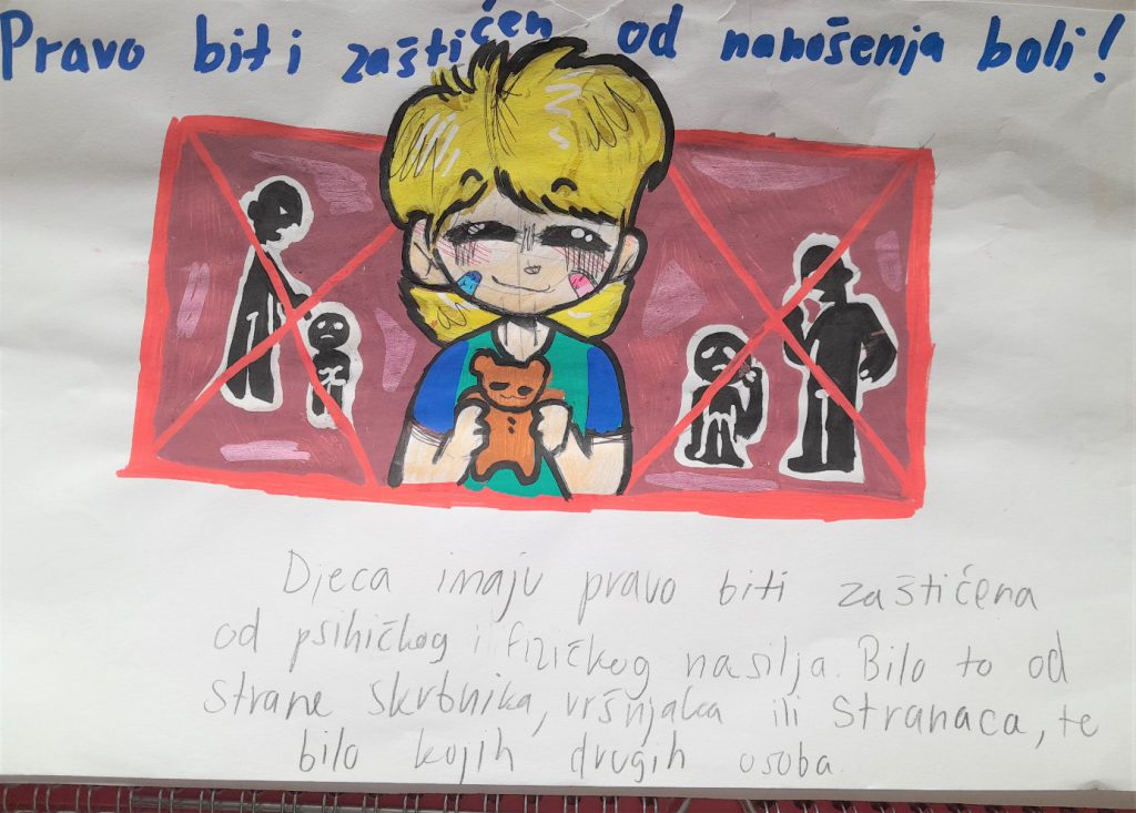 Učenici su u parovima istraživali dječja prava, raspravljali o njima, a zatim kroz likovni izraz prikazali svoj doživljaj istih. Kroz različite poruke iskazali su koliko je važno slušati jedni druge, pokazati razumijevanje, prihvaćati različitosti među ljudima i međusobno se uvažavati.