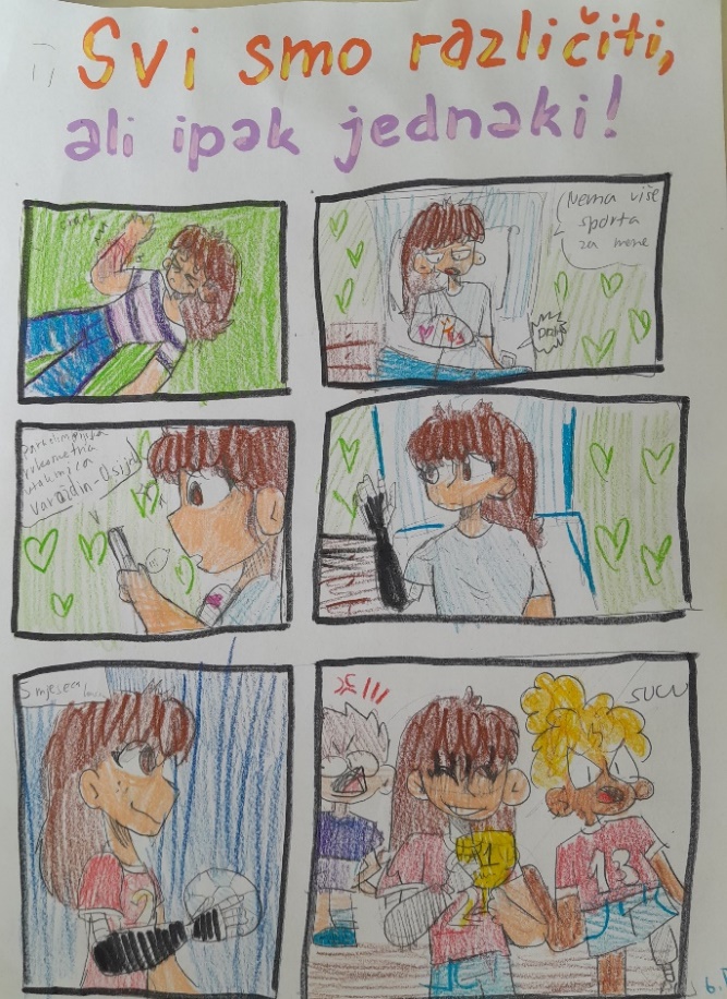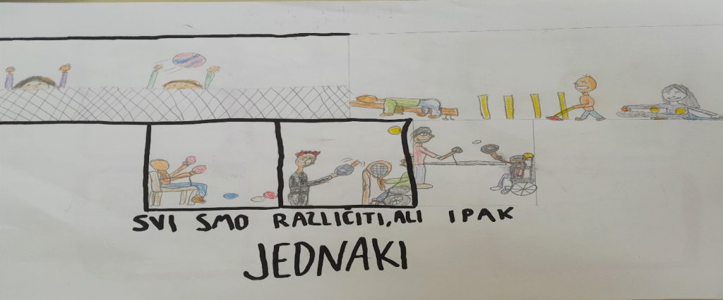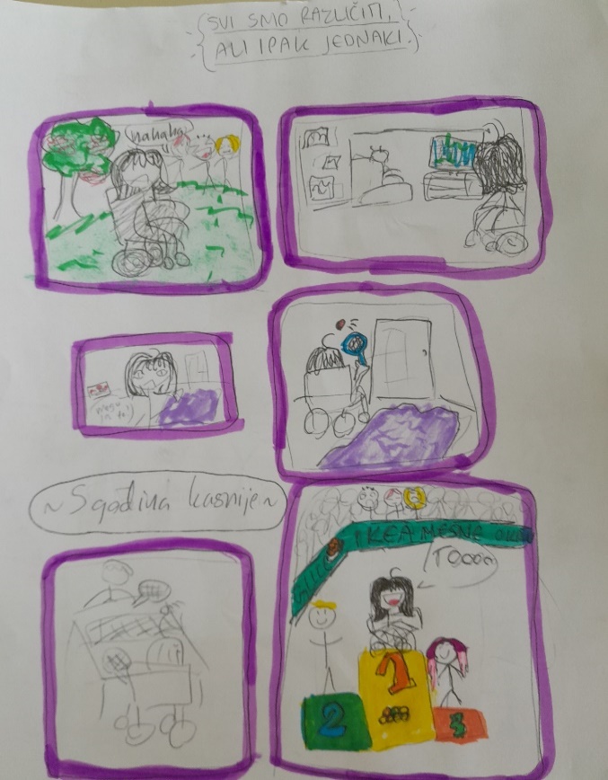 Ovom radionicom učenici su osvijestili važnost prihvaćanja drugačijih i različitih te razvili empatiju i razumijevanje prema osobama s teškoćama. Na kraju su likovno izrazili svoj doživljaj sportske poduke ˝Kreni i pobijedi˝ koja je održana u školskoj dvorani, a čiji cilj je uključivanje što većeg broja djece i mladih s teškoćama u sportske aktivnosti.
