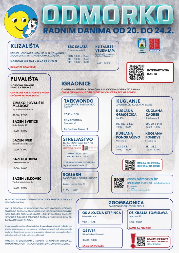 Školski sportski savez Grada Zagreba za vrijeme drugog dijela zimskog odmora (od 20. do 24. veljače) priprema program besplatnih sportskih aktivnosti za učenike osnovnih i srednjih škola.