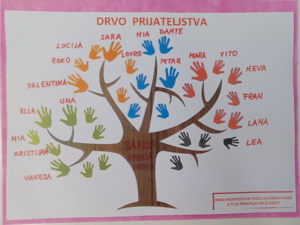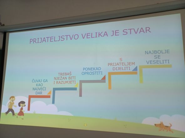 Danas nam je gošća bila psihologinja Dragana Budimir iz Saveza društava distrofičara Hrvatske. Učiteljice Sanja i Vanja bile su ponosne na svoj odjel jer su svojim veseljem, pjesmom i pjesmom pridonijeli lijepom danu. Složili smo se kako je bitno biti prijatelj svaki dan, a ne samo prilikom obilježavanja prigodnih dana.