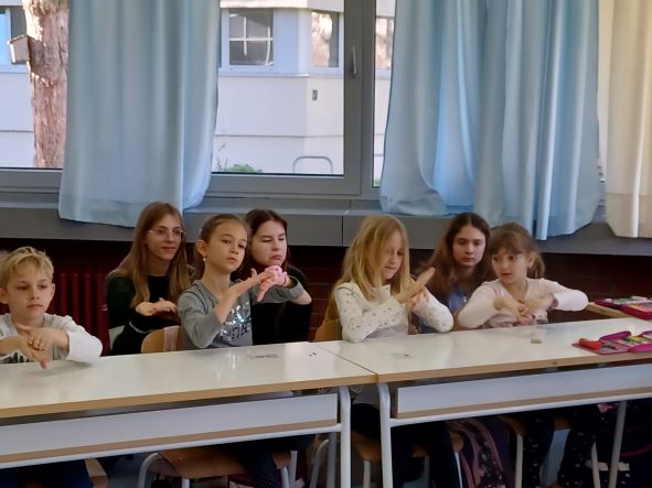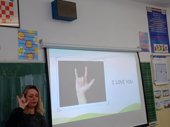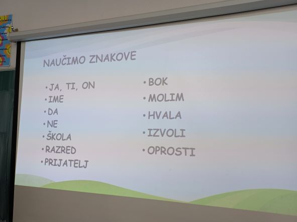 Slijedilo je učenje dvoručne abecede i učenje jednostavnih riječi hrvatskim znakovnim jezikom. Znamo reći i pokazati bitne riječi: Volim školu. Volim učiteljicu. Volim prijatelje. Molim, hvala, izvoli, oprosti.