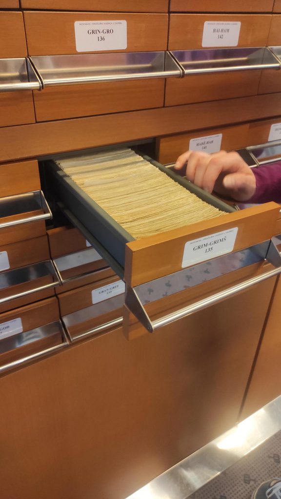 Nakon toga smo posjetili čitaonicu, bila je ogromna, mislim da nema knjige koju nisu imali. Za oko mi je zapela jedna knjiga koja je bila zgužvana i srce mi se slamalo dok sam ju gledala. Nakon toga smo posjetili odjel sa starim novinama gdje smo mogli pomirisat stare novine koje su predivno mirisale. Zatim smo otišli na prizemlje gdje smo mogli vidjeti kartice di su pisale sve moguće knjige, predivo je mirisalo.