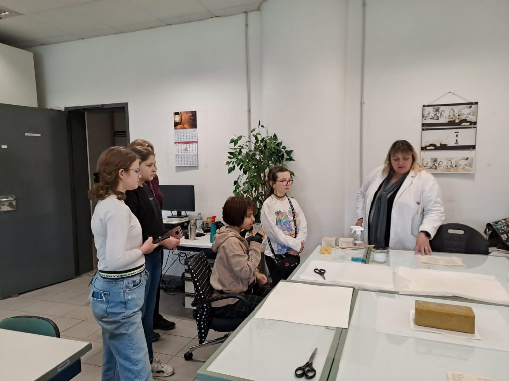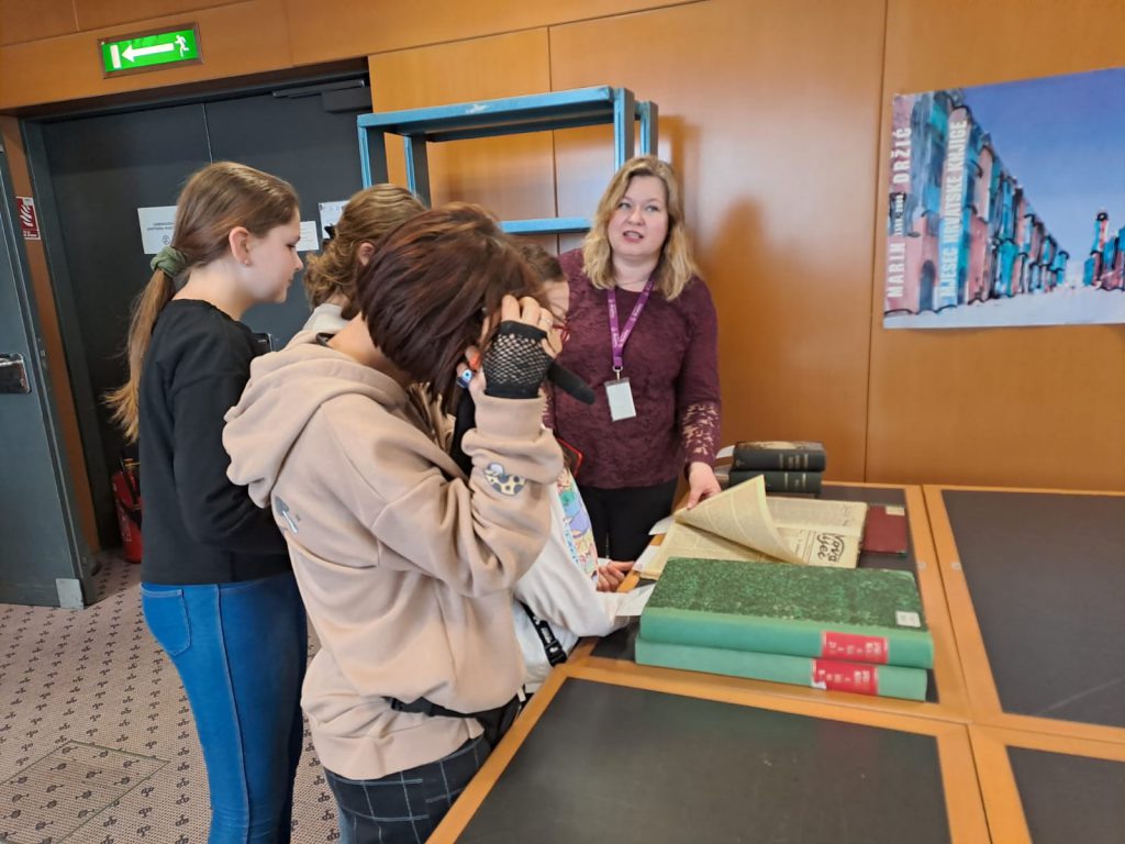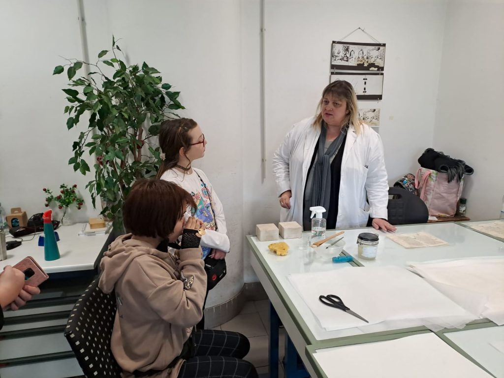 U pratnji knjižničarke Ana Marije Tkalčec posjetili smo Odjel za restauraciju gdje nas je dočekala gđa Karmen i upoznala nas nekim od tehnika očuvanja, restauracije i brige o knjigama.