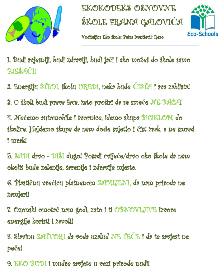 Učenice 7.a razreda i članice Ekoodbora izradile su novi Ekokodeks naše Škole s prepoznatljivim i najvažnijim porukama koje želimo prenijeti na druge učenike, učitelje i sve čitatelje.