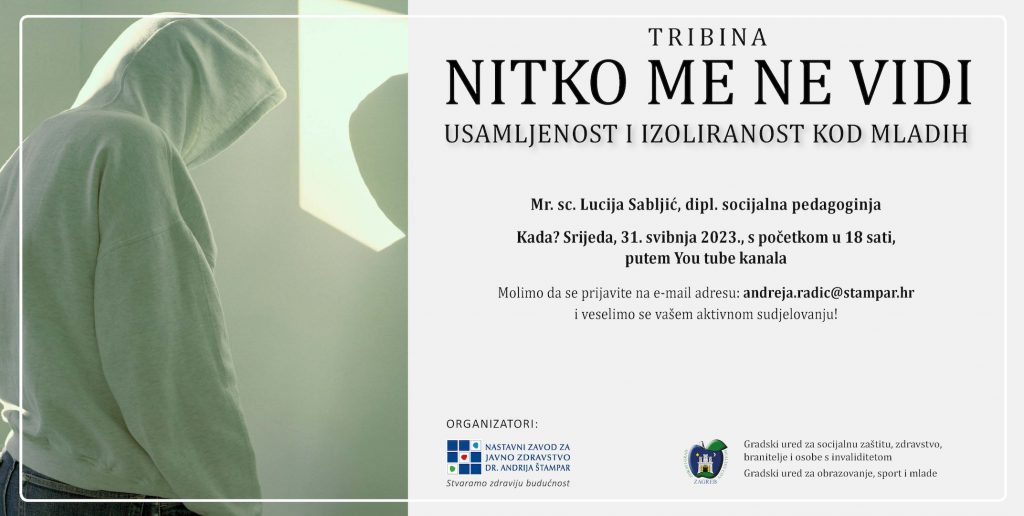 svakodnevno svjedočimo činjenici da je sve više mladih ljudi kod kojih se uočava usamljenost, nemogućnost sklapanja prijateljstava i emotivnih veza. Svoje vrijeme provode uglavnom sami ili pred ekranima, pokušavajući nekako nadoknaditi stvarnu povezanost s drugima. O razlozima i posljedicama ovih stanja bit će govora na tribini „NITKO ME NE VIDI – usamljenost i izoliranost kod mladih“.