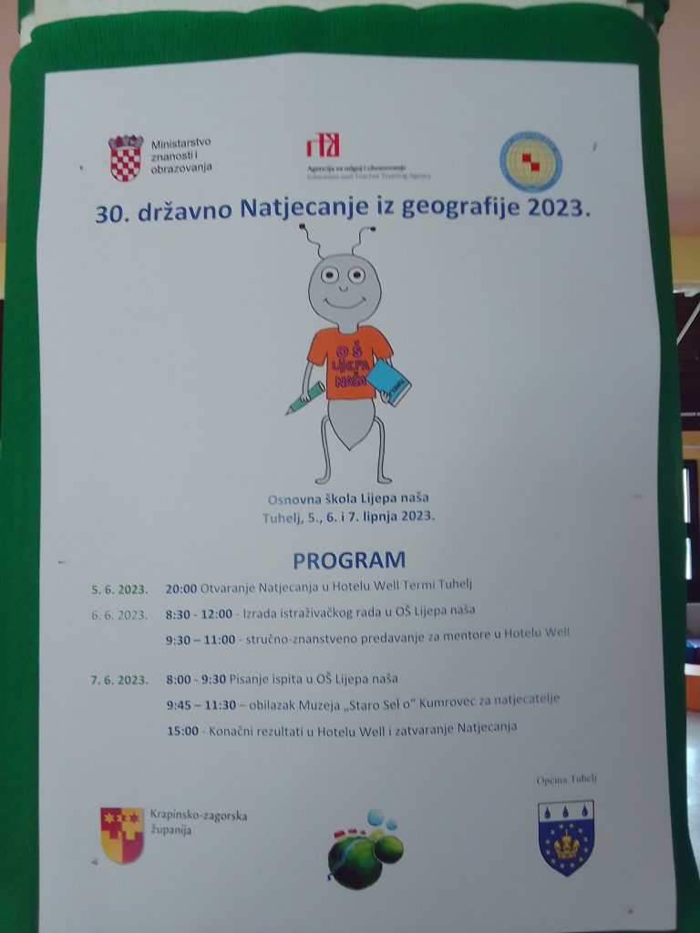 XXX. državno Natjecanje iz geografije održano je od 5.- 7. lipnja 2023. godine u OŠ Lijepa naša u Tuhelju.