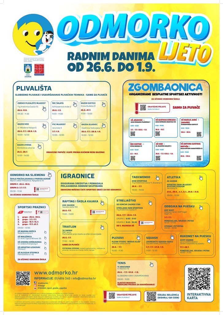 Školski sportski savez Grada Zagreba je pripremo program Odmorko ljeto 2023. za vrijeme ljetnih učeničkih praznika koji će se provoditi od 26. lipnja do 1. rujna 2023. godine.