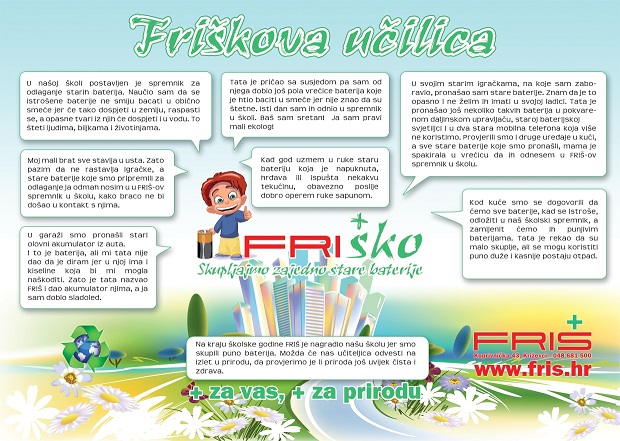 Tvrtka Friš nagradit će najbolji razred u sakupljanju, a školi će za svaku skupljenu količinu donirati 0,53 €/kg skupljenih baterija na žiro-račun škole.
