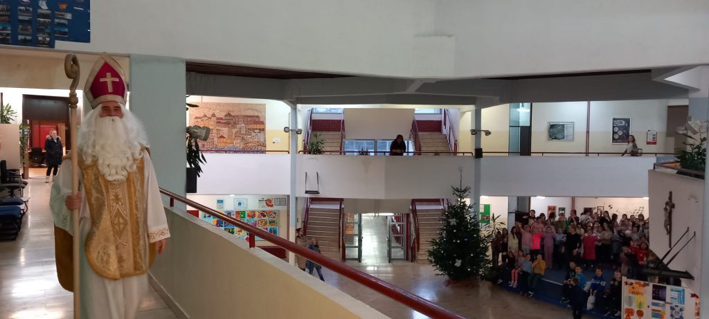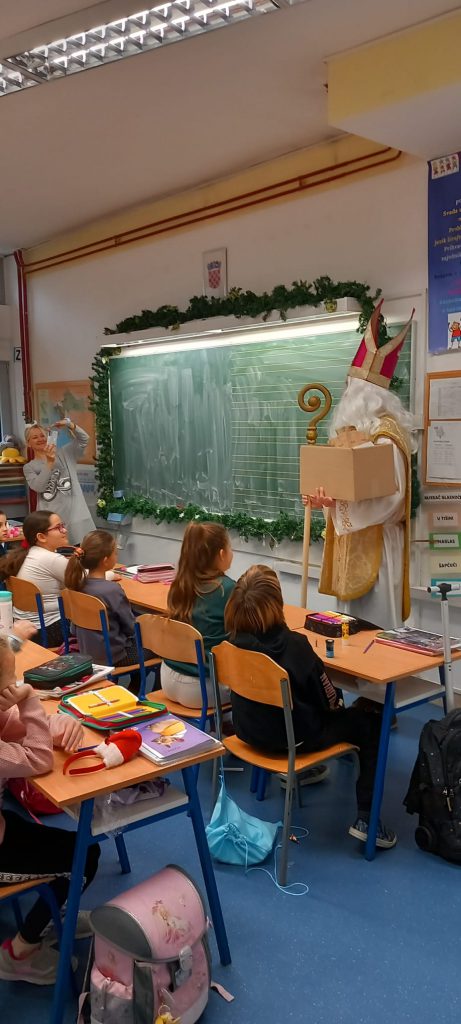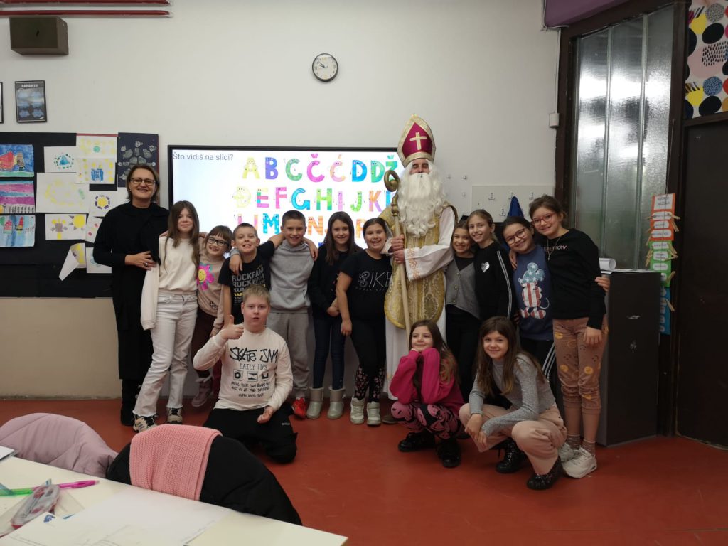 I ove godine je 6. prosinca sv. Nikola posjetio učenike naše škole koji su ga nestrpljivo čekali. Izrazio je radost što mu je omogućeno da na trenutak napusti nebo i susretne se s ljepotom dječjeg neba koje naši mališani nose u sebi i koje se oslikava u njihovom iskrenom pogledu. Poručio im je da trebaju jedni druge darivati dobrotom i ljubavlju. Trudili su se biti dobri pa Krampusa nije bilo. Podijelio je poklone i rekao da ne dozvole Krampusu da ih odvede na svoj put kako bi se mogli vidjeti i druge godine. Učenici su ga radosno ispratili, a potom je sv. Nikola svratio i do zbornice u kojoj se susreo s nekolicinom učitelja i ravnateljicom te im zahvalio što odgajaju i obrazuju nove naraštaje jer su upravo oni budućnost svijeta.