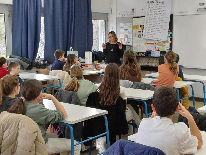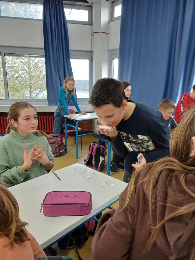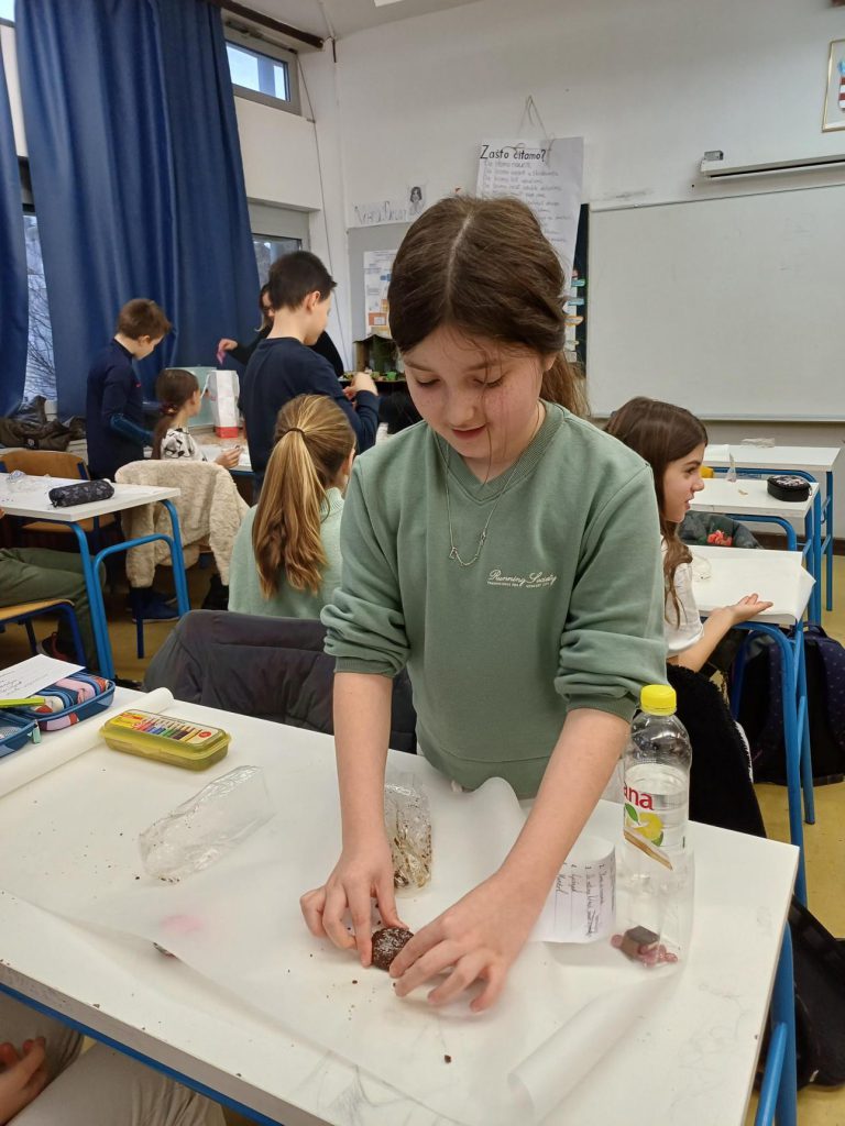Gospođa Petra Mihalić, prehrambena tehničarka i idejna začetnica uspješnog brenda Bite Me, poznatog po zdravim proteinskim pločicama i keksićima, u 5. b razredu održala je radionicu izrade zdravih slastica. U mjesecu čitanja omiljenog dječjeg romana Charlie i tvornica čokolade te gledanja najnovijeg filma Wonka u Cinestaru, učenici su se upoznali s procesom nastanka novog prehrambenog slatkog proizvoda. Zaključili su kako je za poček najvažnije imati dobru ideju, a potom i odličan njuh, bez kojega nema dobrog proizvoda. Učenici su najprije testirali svoj njuh pogađajući koji se mirisi kriju u prozirnim kutijima, kušali su različite vrste čokolade te grickali zrnca kakaovca (baš kao i Oompa Loompasi, samo s malo manjim oduševljenjem), a potom su u dobivenu zdravu smjesu od datulje i orašastih plodova dodavali različite začine prema vlastitom ukusu kreirajući tako nove slatke proizvode. Nakon kušanja različitih kuglica, učenici su zaključili kako su neki bili uspješniji od drugih (koji su u količini omiljenog začina ipak mrvicu pretjerali).