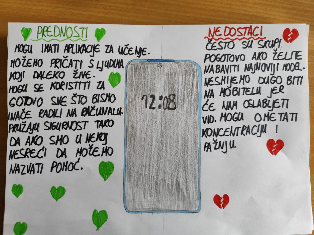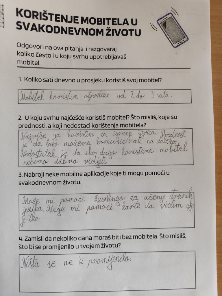 Učenici su pogledali filmske uratke Mobi-Zombi i Bez veze. Nakon toga slijedila je rasprava o korištenju mobitela u svakodnevnom životu. Učenici su popunili anketu kojom se ispitalo za što najčešće koriste mobitel. Tada su otišli u obližnji park i isprobali neke mobilne aplikacije koje im mogu pomoći u svakodnevnom životu (Pl@ntnet, Kompas, Google maps…) te rezultate istraživanja (npr. nazivi biljaka ili ulica koje okružuju školu) zabilježili na listić.