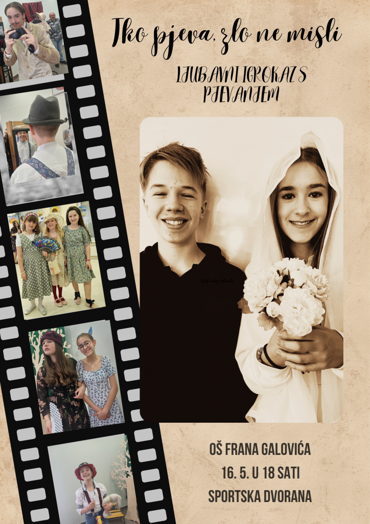 Učenici i učitelji pozivaju vas na obilježavanje Dana Osnovne škole Frana Galovića 16. svibnja, u 18 sati. S velikim smo veseljem pripremali ovaj “ljubavni igrokaz s pjevanjem” nastao prema istoimenom kultnom filmu Kreše Golika. Radujemo se vašem dolasku i podršci našim glumcima, lutkarima, pjevačima, plesačima i scenografima.