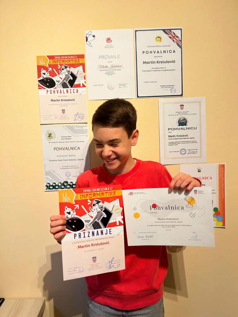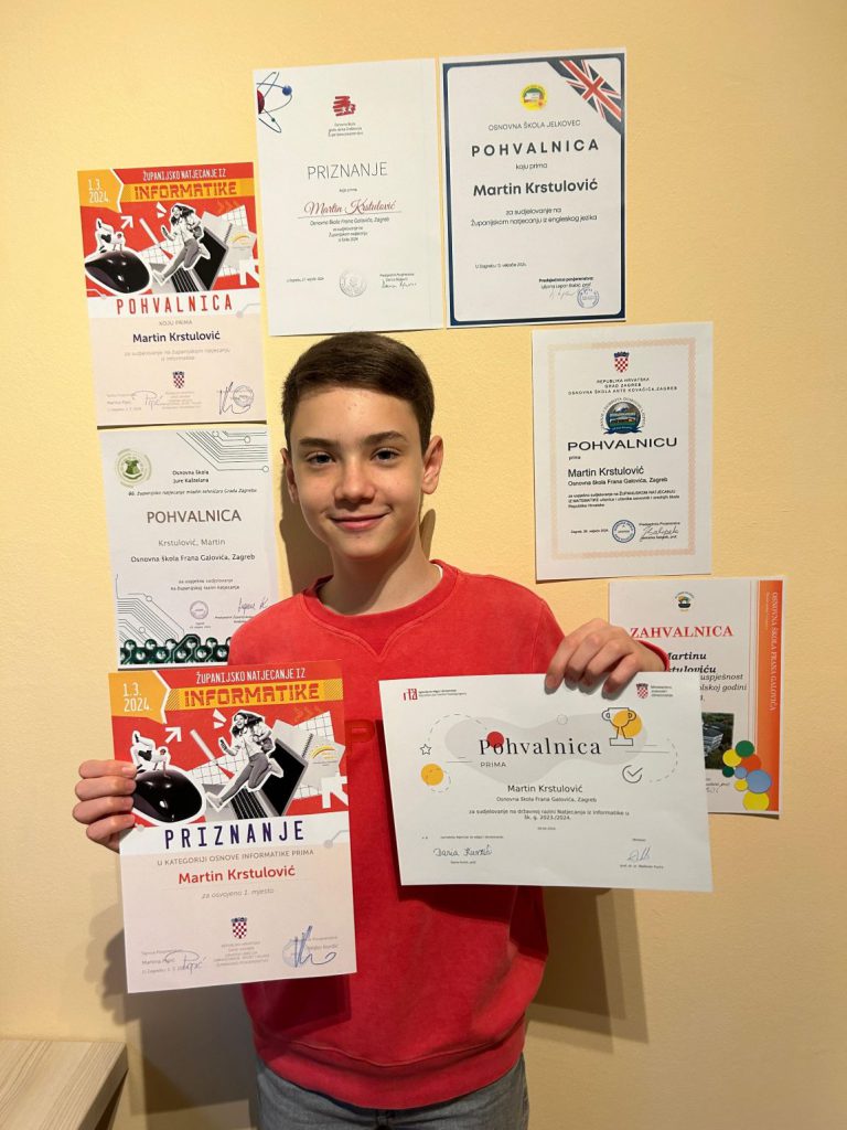U našoj školi ovu nastavnu godinu obilježili su vrhunski uspjesi i rezultati u natjecanjima znanja iz različitih područja. Kaže se da nije svatko za sve, da ne možemo baš biti dobri u svemu i da će svatko naći svoj put. No, pokad se ipak posloži da se u jednoj osobi krije lumen kakav se rijetko nađe. Takav je i naš Martin Krstulović, učenik 8.d razreda.Tih, samozatajan, drag dječak, a povrh svega, uspješan i izvrstan – jezičar, matematičar, informatičar… Naime, ove je godine naš Martin sudjelovao u čak sedam natjecanja: na županijskoj razini iz Matematike, Fizike, Natjecanje mladih tehničara, Engleskog jezika, te je osvojio 7. mjesto na državnom natjecanju iz Informatike. Zaslužio je svaku pohvalu i čestitke. Ponosni smo što je on naš Galović i želimo mu da i dalje ovakve rezultate postiže u svome obrazovanju.