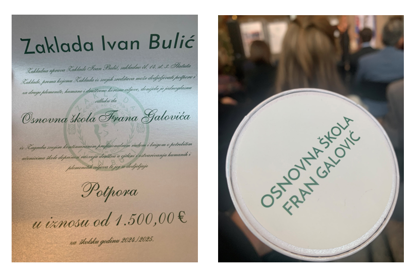 Prošle godine, u blagdansko vrijeme, dobili smo pozivnicu da prisustvujemo 8. Svečanoj sjednici Zaklade Ivan Bulić. OŠ Frana Galovića nije izostavljena s popisa pozvanih što je za nas posebna čast, a našim pojedinim učenicima dar za bezbrižno školovanje u ovoj školskoj godini.