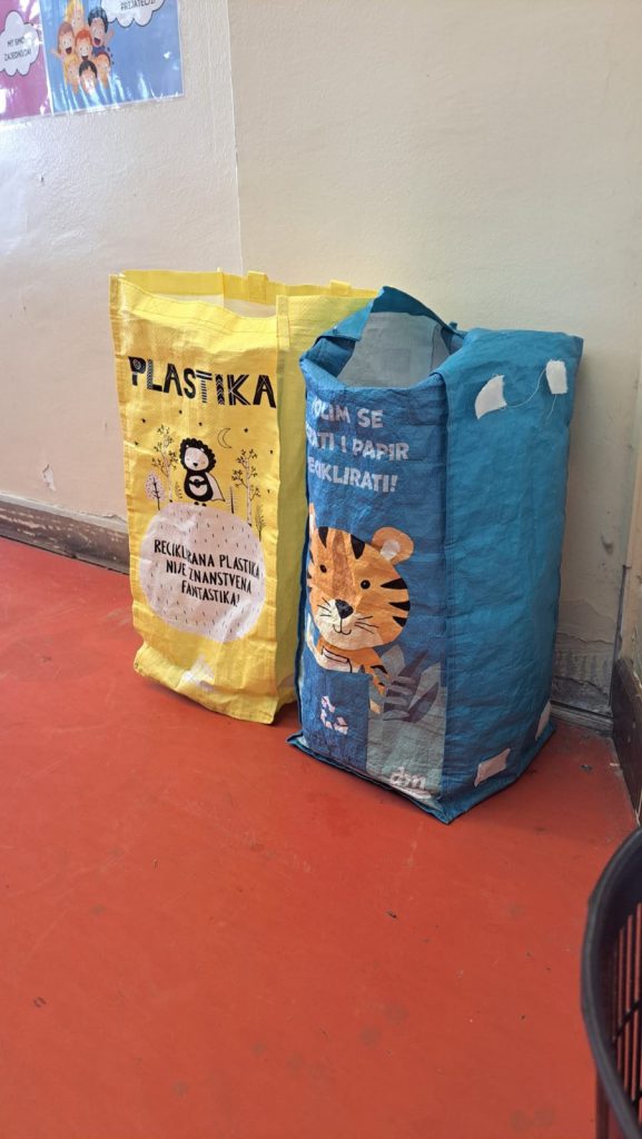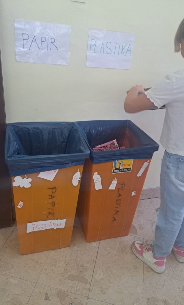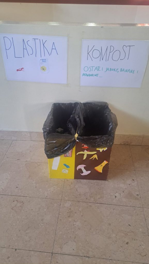 U blagovaonici škole postavili smo nove spremnike, gdje učenici nakon mliječnog obroka odvajaju papir i plastiku. Sami se brinu o odvajanju otpada, a u poseban spremnik za kompost mogu odvojiti ostatke od jabuka, mandarina, banana i sl.