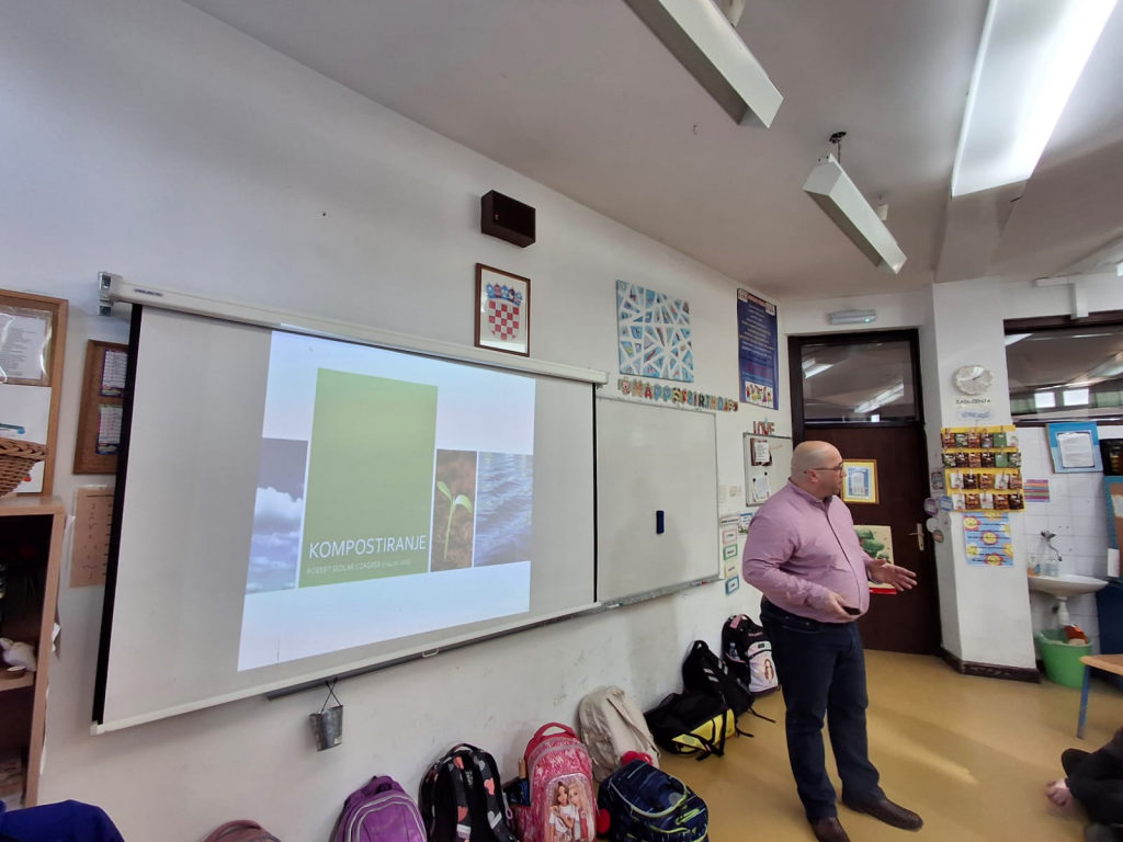 Učiteljice Sanja Minarik i Danijela Gracin, sudionice Erasmus projekta Zeleni glas s Jakuševca, organizirale su u našoj školi stručno predavanje na temu kompostiranja. Predavač je bio roditelj, gospodin Robert Sedlar. Uputio nas je kako i zašto kompostirati te nam predstavio mogućnosti kompostiranja otpada iz školske kuhinje. Kompostiranje je odgovoran i aktivan način sudjelovanja u očuvanju čistog i zdravog okoliša. Vjerujemo da ćemo u budućnosti, u našoj novoj školi, ozbiljnije prionuti procesu kompostiranja kako bismo naš planet učinili održivijim i zdravijim mjestom za generacije koje dolaze.