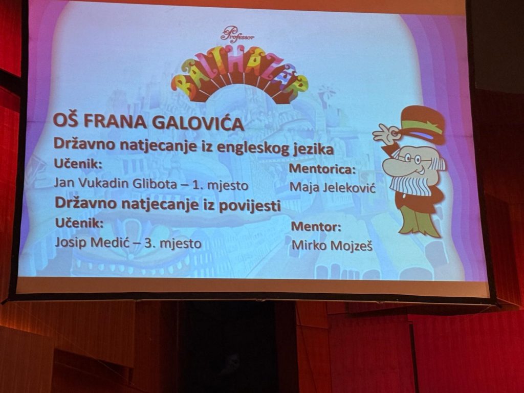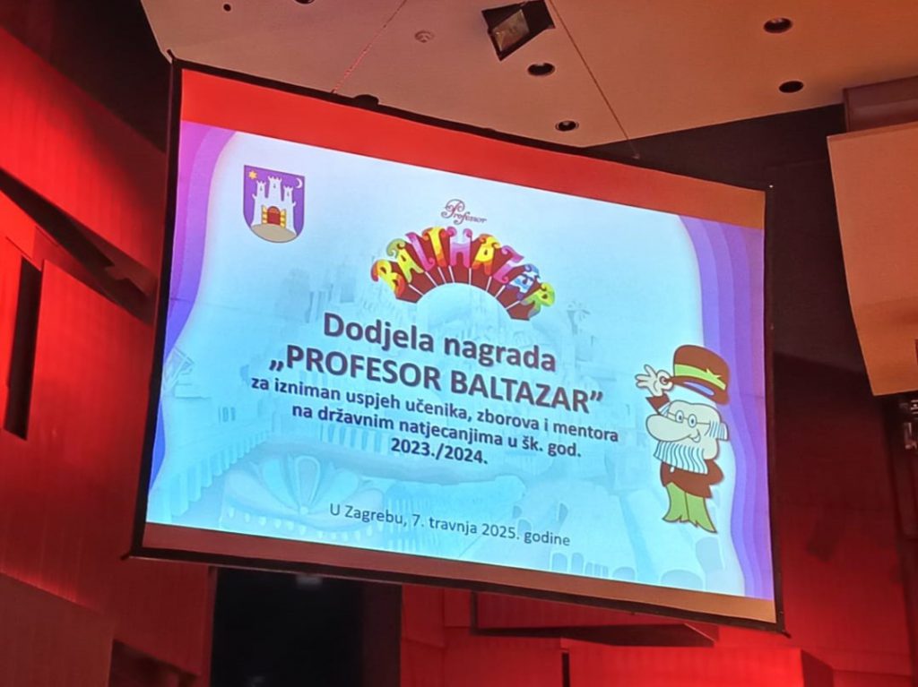 Grad Zagreb dodijelio je 7. travnja Nagradu Professor Balthazar kao priznanje učenicima zagrebačkih osnovnih i srednjih škola koji su na državnim natjecanjima u znanju, strukovnim vještinama, glazbi i plesu protekle školske godine osvojili prvo, drugo ili treće mjesto. Uz učenike, nagradu primaju i njihovi mentori koji također imaju zasluge u uspjehu. Naši prošlogodišnji najuspješniji učenici su Jan Vukadin Glibota, koji je osvojio 1. mjesto na državnom Natjecanju iz engleskog jezika te Josip Medić, koji je osvojio 3. mjesto na državnom Natjecanju iz povijesti. Učenici su,